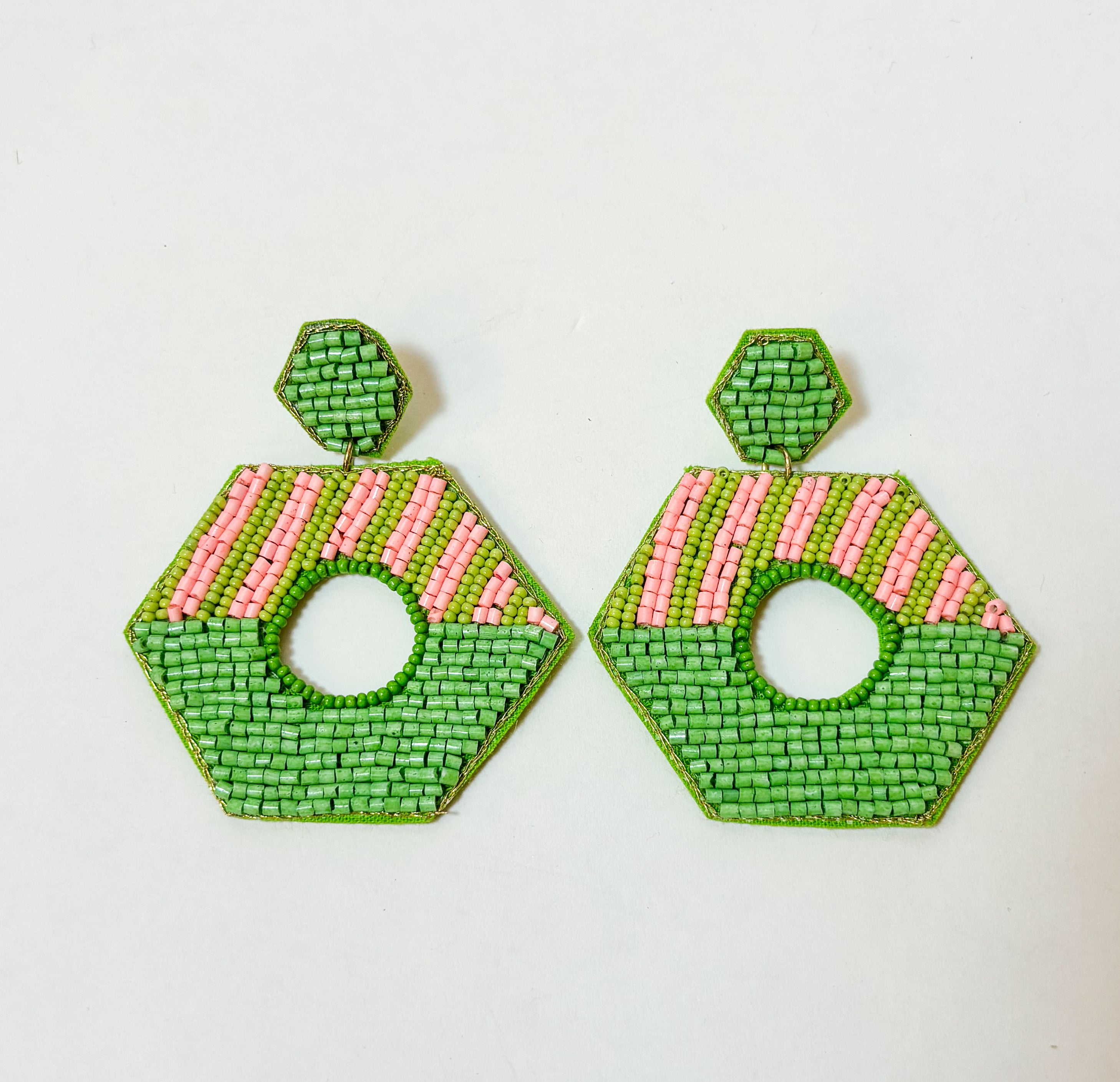 These Beaded Hexagon Earrings are a stylish and colorful addition to any outfit. Made with high-quality beads in a variety of green shades, these earrings are perfect for adding a pop of color to your look. The hexagon shape adds a unique touch to these high-quality earrings.