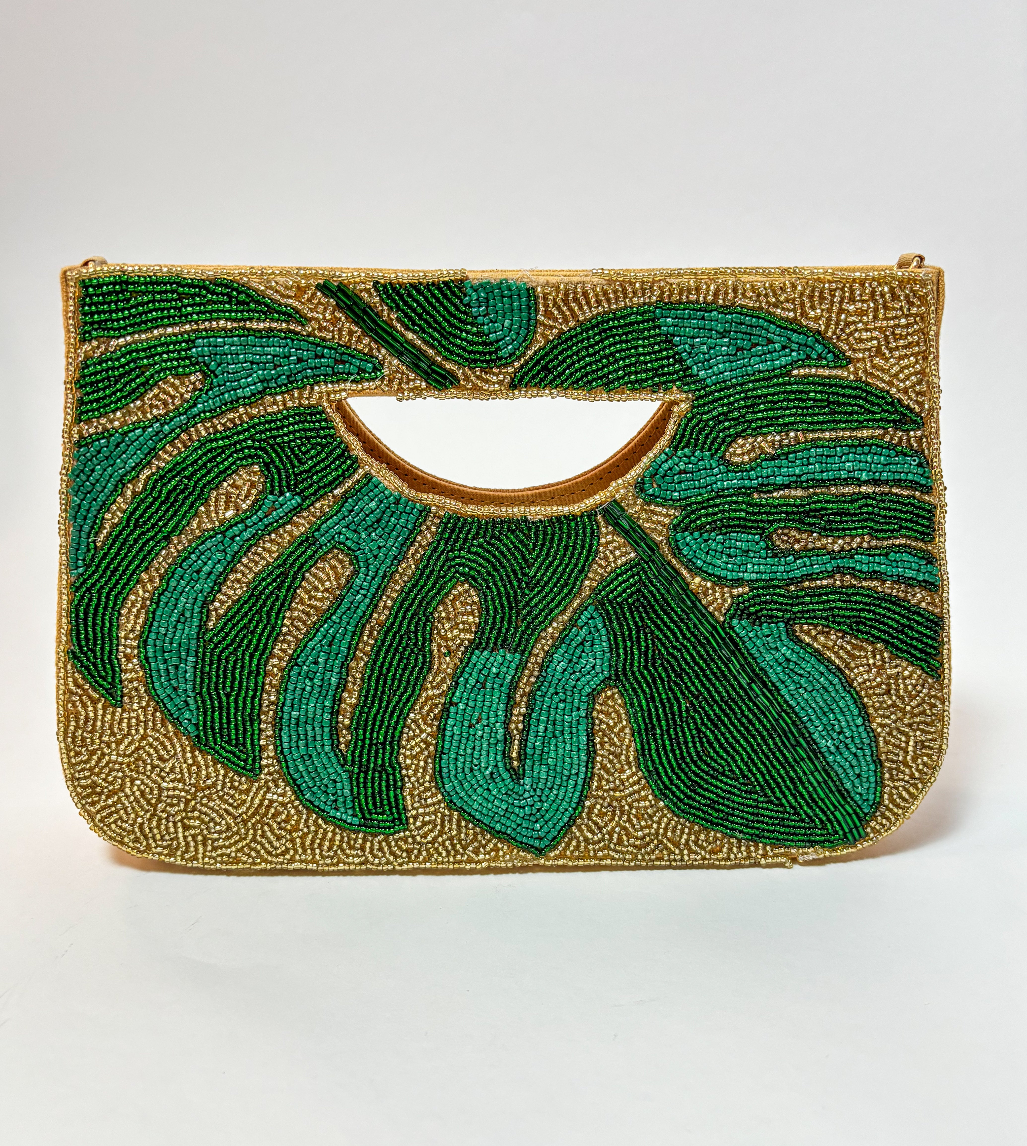 This Beaded Leaf Handbag is the perfect accessory for any tropical adventure. Featuring elegant beaded leaves, it adds a touch of fun and sophistication to your outfit. Enhance your style with this must-have handbag.