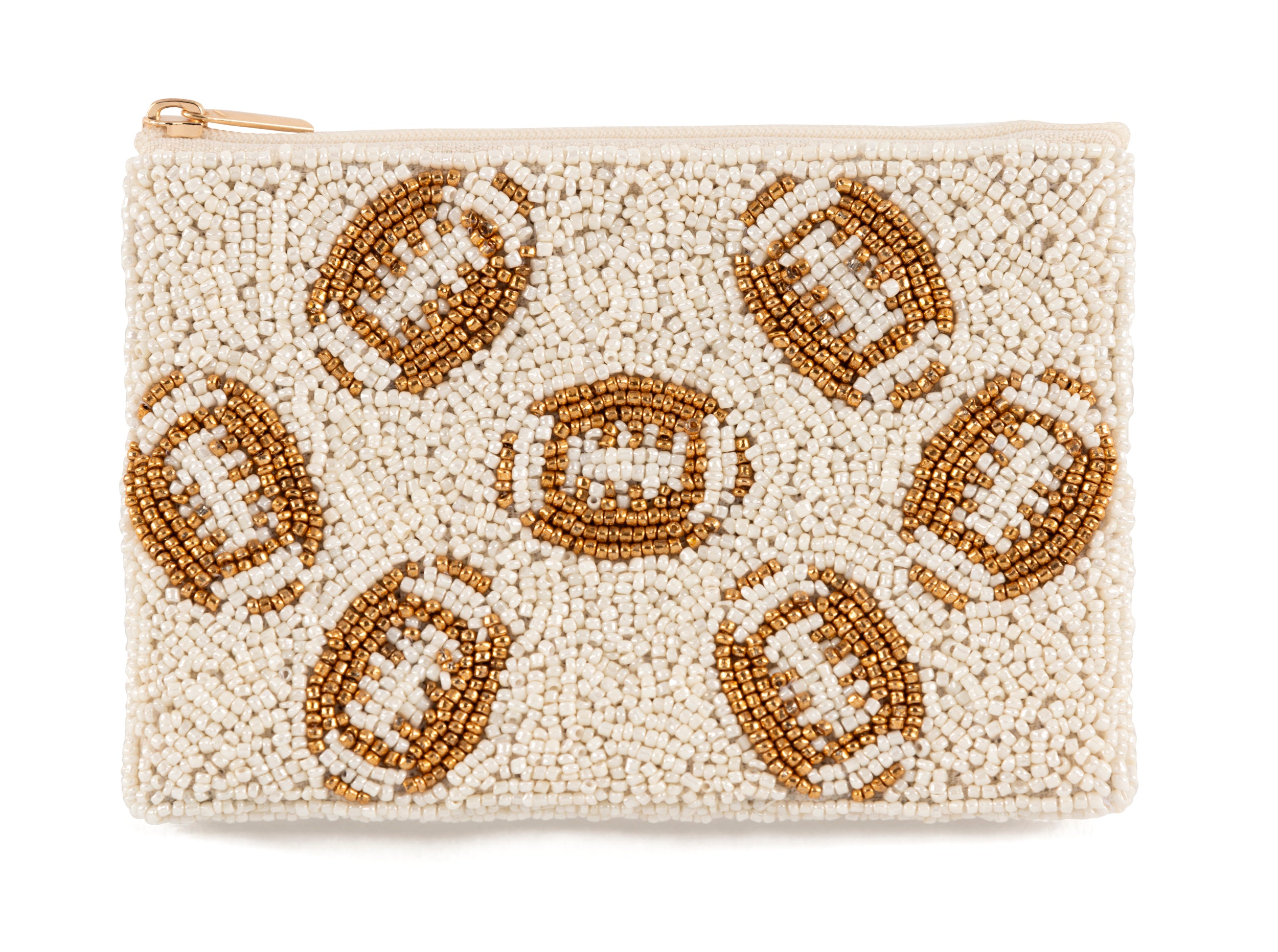 Get ready for game day with our Footballs Beaded Zip Pouch! Perfect for tailgating, this clear bag essential will keep all your necessities organized. Don't fumble around with a bulky bag, go for a stylish and convenient option. Touchdown!