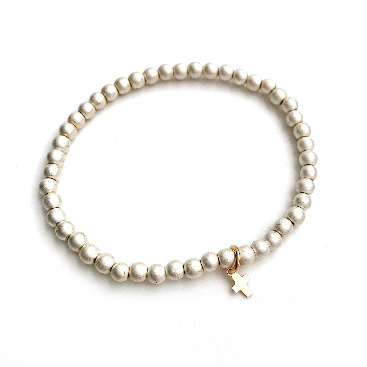 Add a touch of elegance and beauty to any outfit with our Luxe Cross Bracelet in White. This single stacking bracelet features a pearled wood design and includes our 14k gold filled little luxe cross. Perfect for stacking with other Erin Gray Stack Bar favorites, this 7 inch stretch bracelet is a must-have accessory.
