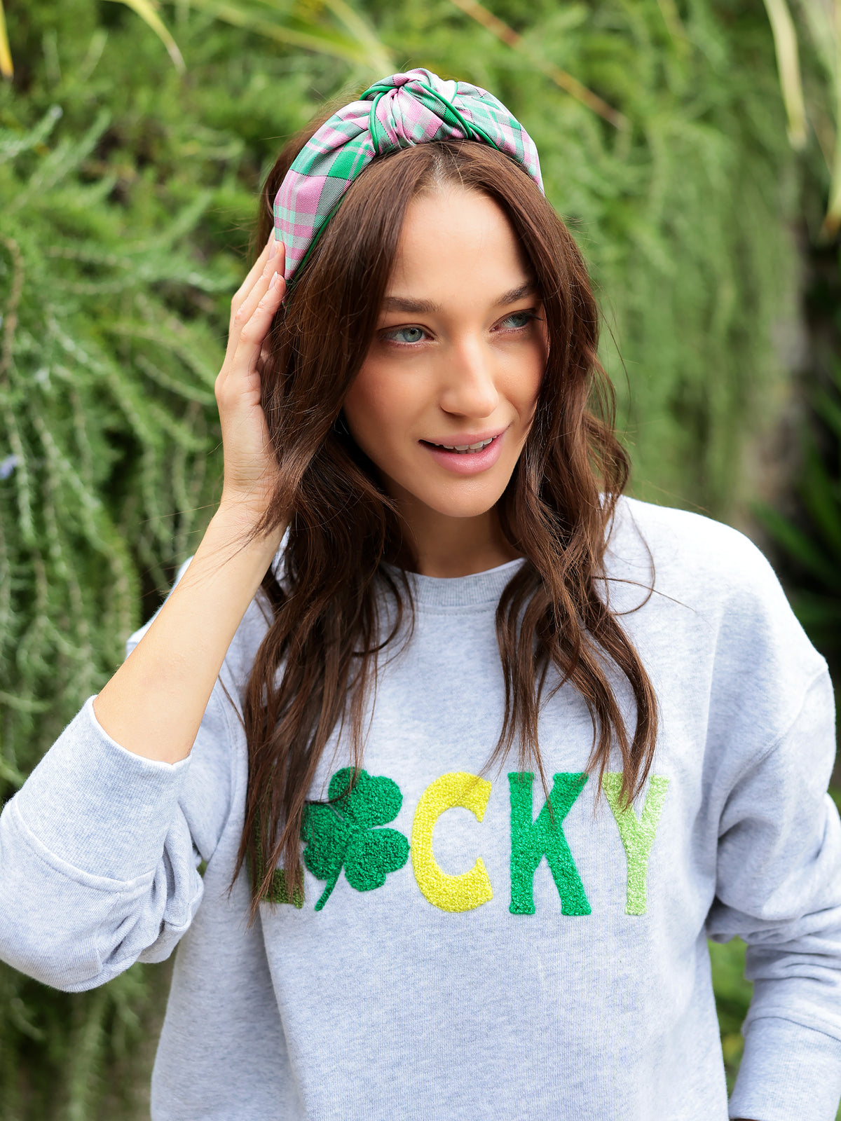 This headband features a playful plaid pattern in refreshing pink and green hues, perfect for adding a cheerful touch to your look. The knotted design offers texture and elegance, while the green trim adds a bright pop of color. Its soft fabric ensures comfort for all-day wear, making it ideal for both casual and dressed-up outfits. This headband is a fun and stylish accessory that will complement any wardrobe.