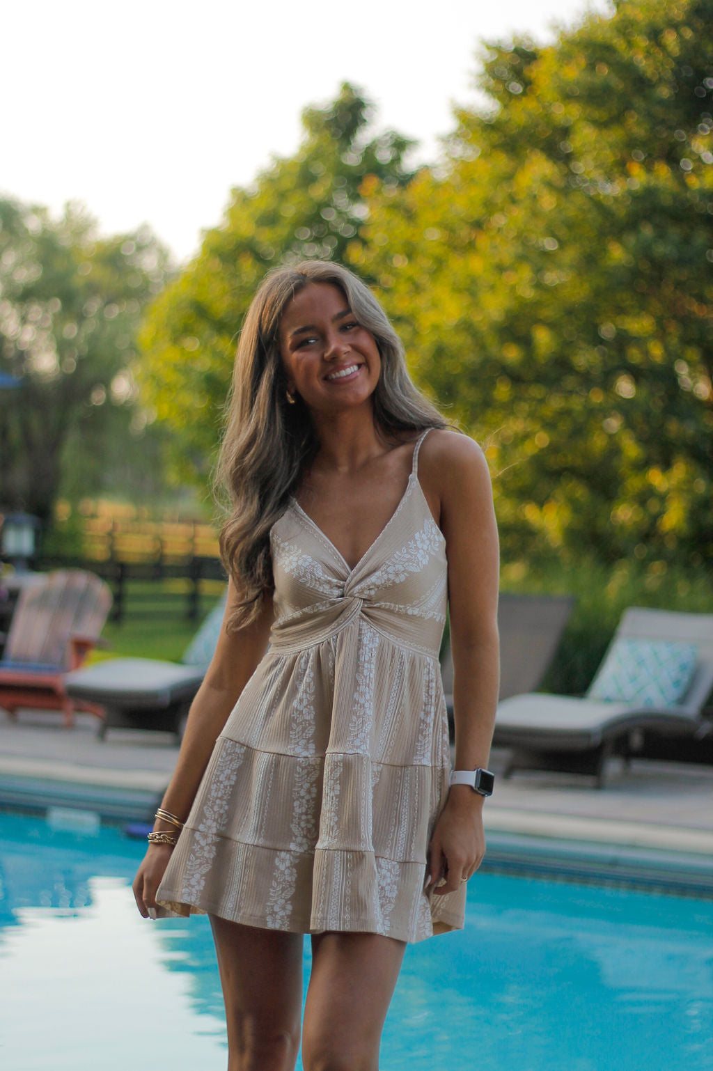 Get ready to turn heads in our Sand Dune Hibiscus Print Rib Twist Front Dress! This playful dress features a twist front design and a unique hibiscus print that will have you feeling confident and stylish. Perfect for a day at the beach or a night out with friends.