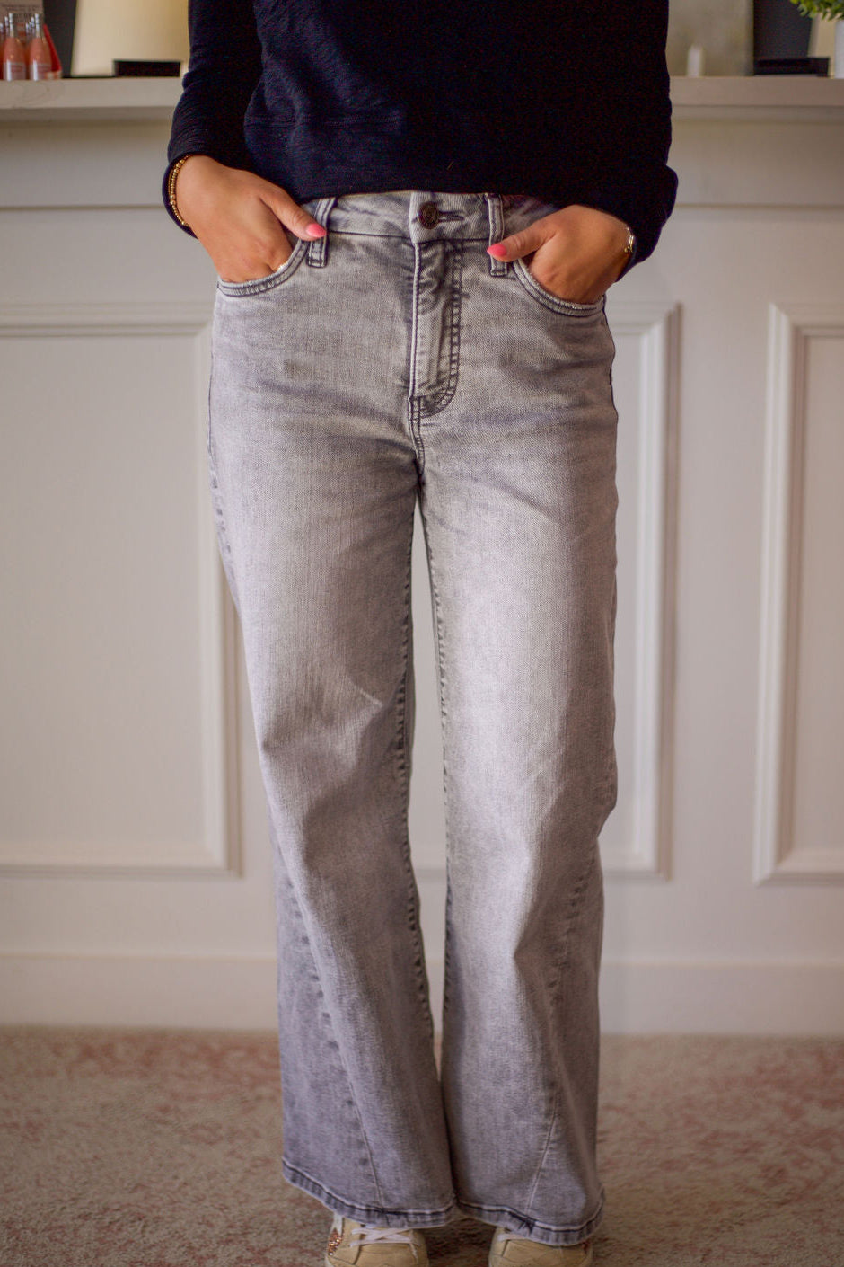 Step out in style with Meg High Rise Wide Leg jeans by Kut from the Kloth. These grey jeans feature a unique seam on the front of the leg for added charm. Elevate your wardrobe with this trendy and comfortable pair! (No serious fashionista necessary).