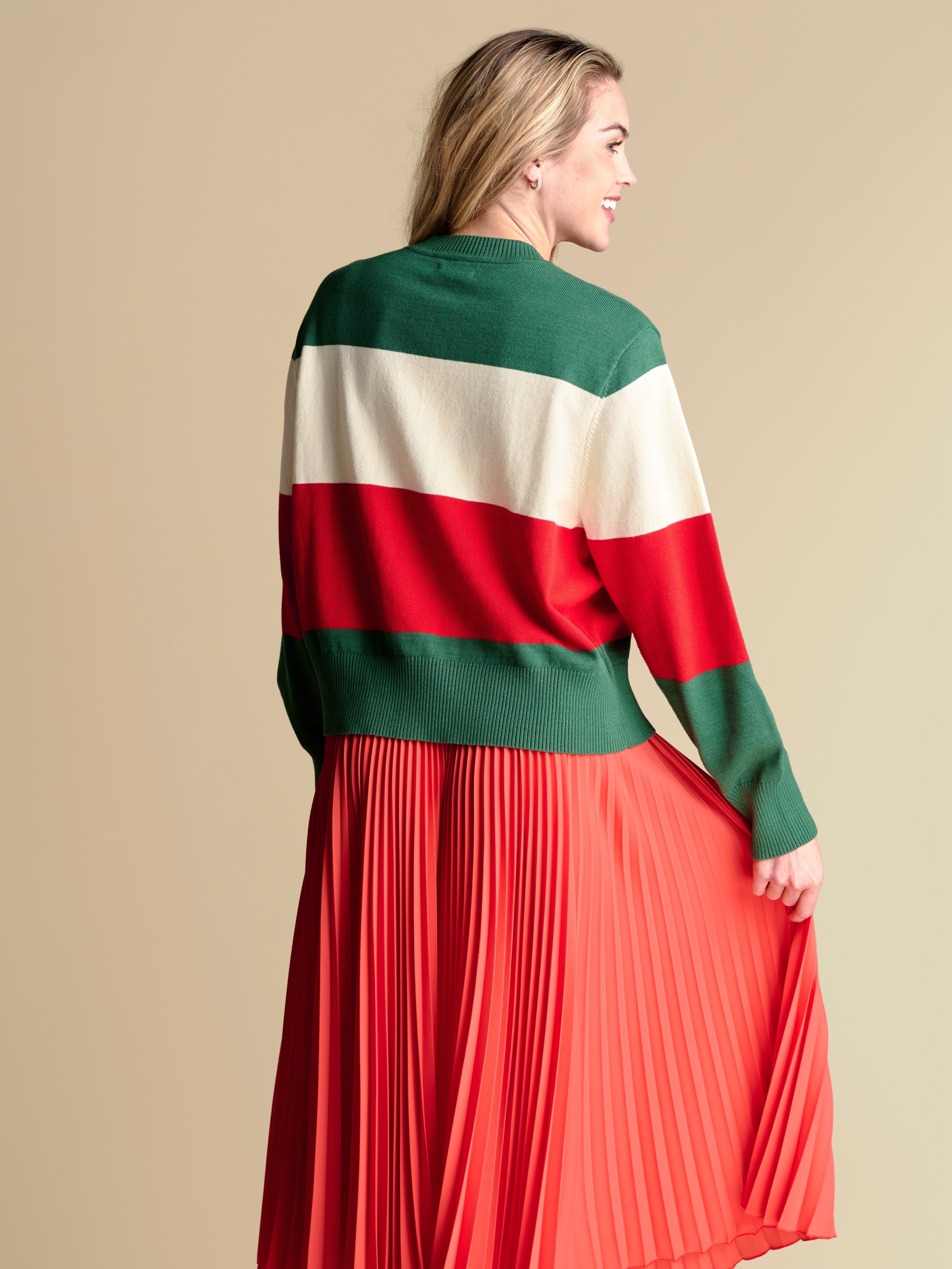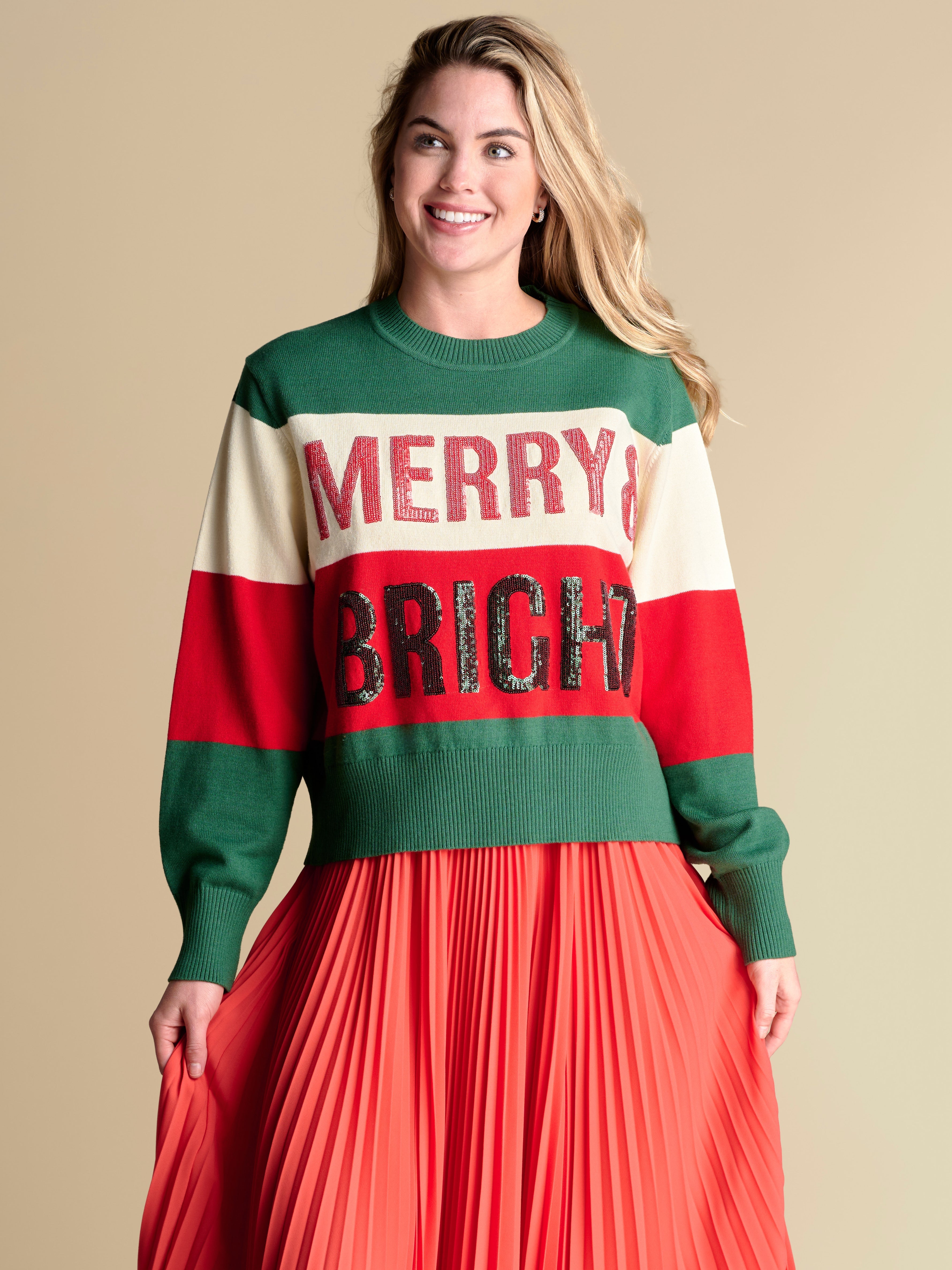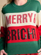 Brighten your holiday wardrobe with our joyful Merry and Bright Colorblock Sweater, a relaxed-fit knit that perfectly captures the spirit of the season. This eye-catching sweater features bold blocks of festive green, classic red, and crisp white, beautifully accented with dazzling sequin wordmarks that spell out "MERRY" and "BRIGHT." It's the ideal blend of cozy comfort and sparkling style, ready to add a touch of cheer to any festive occasion.