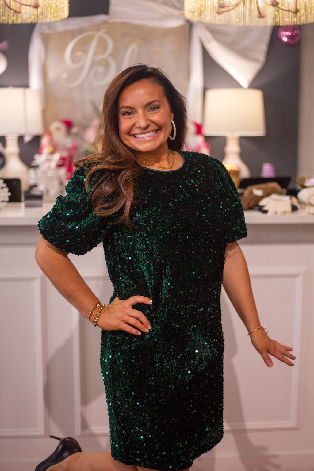 This glamorous knee-length dress shines with intricate sequin detailing over a soft velvet base, creating a luxe and eye-catching look. Designed with puff sleeves and a flattering silhouette, it offers both elegance and comfort. Perfect for holiday parties, evening gatherings, or special occasions, it’s a statement piece that radiates sophistication.
