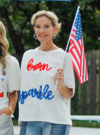 Celebrate in style with our Born to Sparkle Lurex Thread Embroidery Top! This white top features delicate lurex thread embroidery that adds a touch of sparkle to any outfit. Perfect for the 4th of July, show off your patriotic spirit with this playful and fun top.