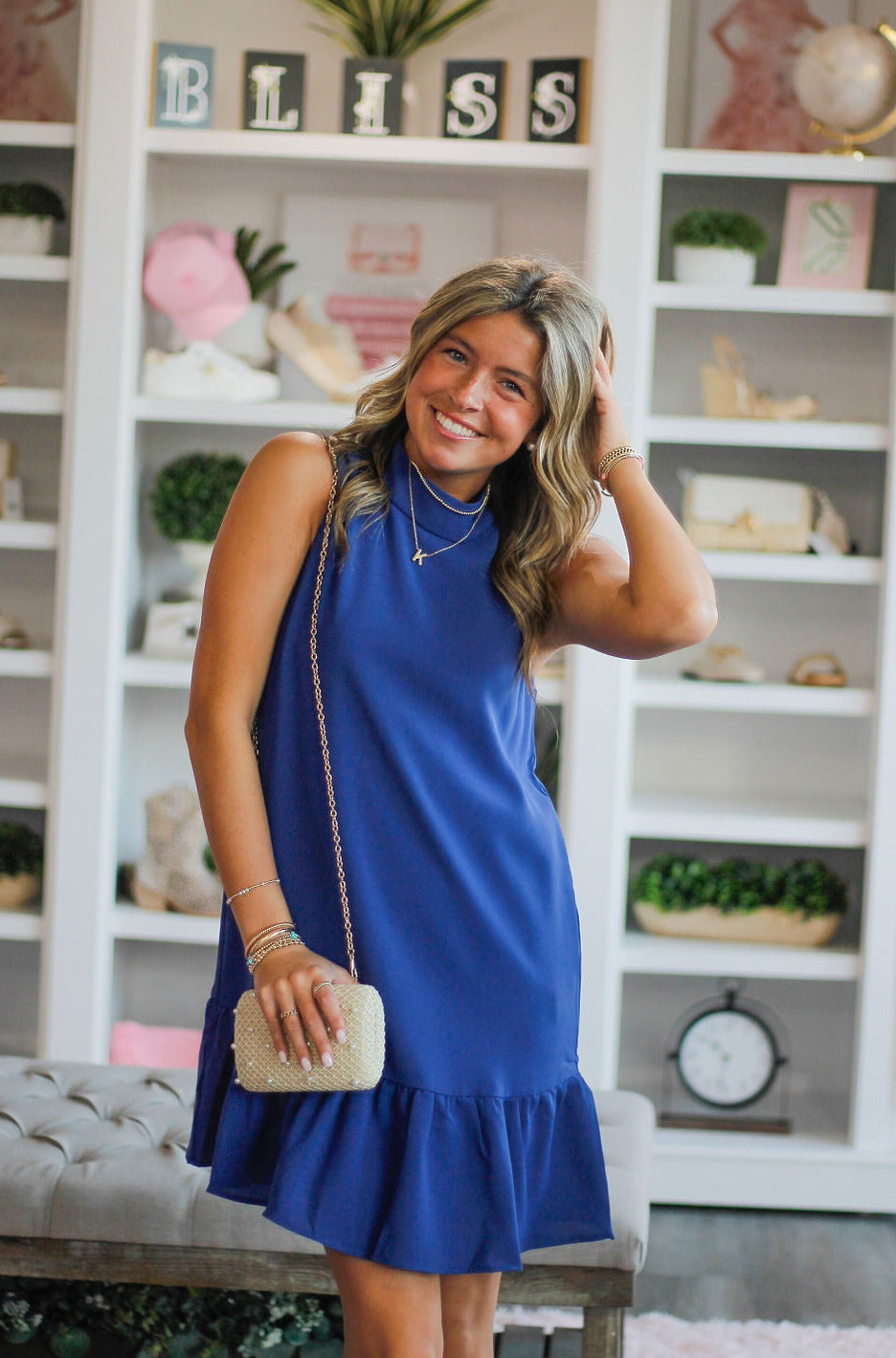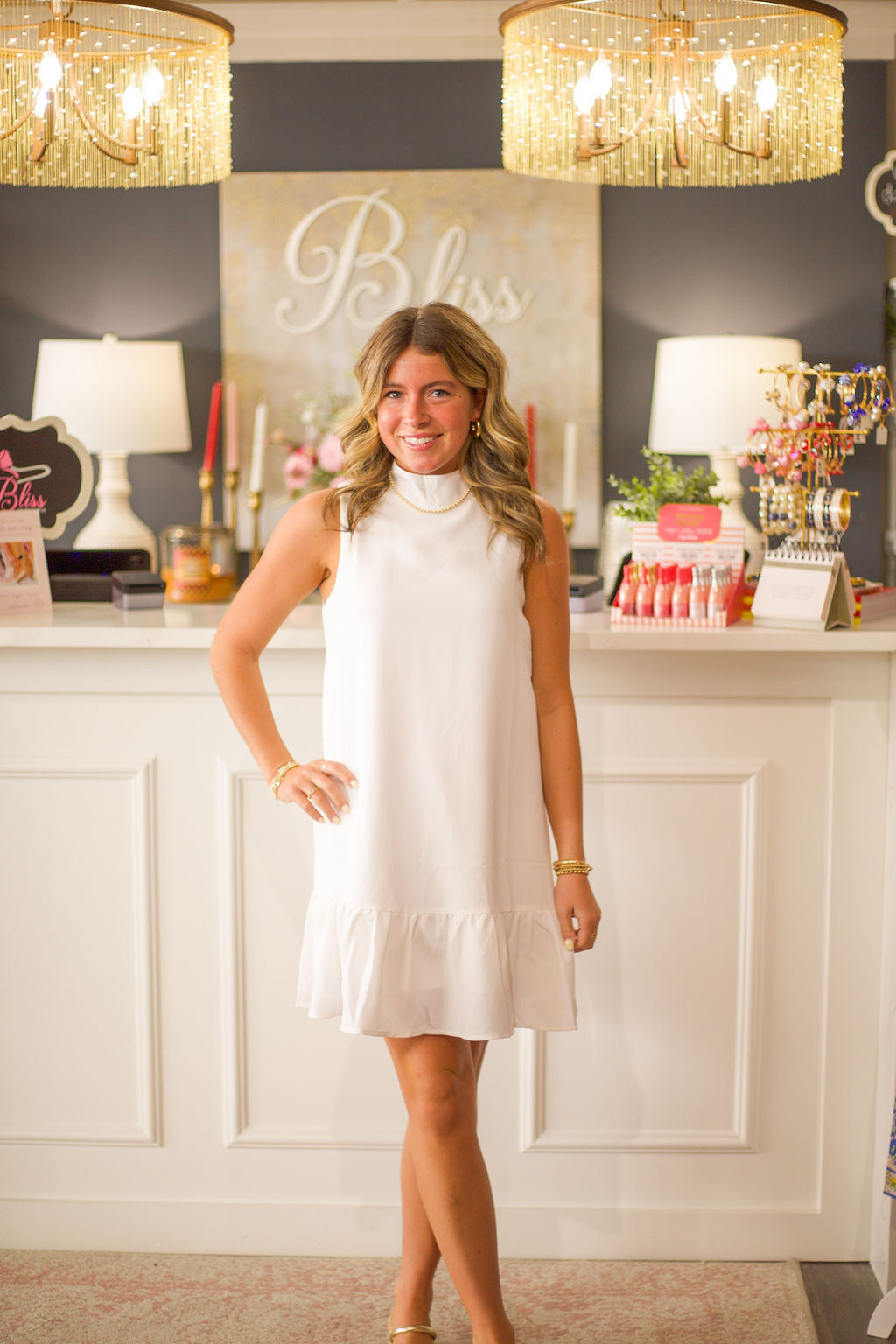 This high neck dress offers a unique silhouette with its dropped waist and ruffle hem, creating a modern and feminine look. The back hidden zipper ensures a seamless appearance. Finished in a beautiful white color, this dress is both versatile and stylish.