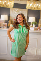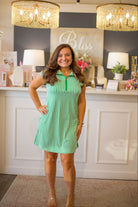 Introducing Dress Sanibel Lined Up by Mary Square. This knee-length dress features a 1/4 zip front for added style and convenience. Made with soft fabric and UPF 50+ protection, it offers both comfort and sun protection. Perfect for any occasion.