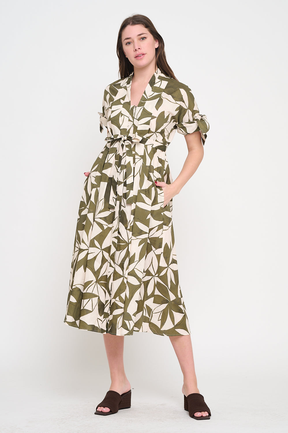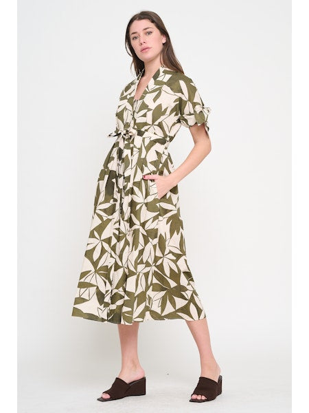 This midi shirt dress blends structured tailoring with effortless flow, featuring a button-front design, short sleeves with tie accents, and a self-tie belt that cinches the waist for a flattering shape. The lively allover print adds a fresh, modern touch, while side pockets bring both style and practicality to the look.
