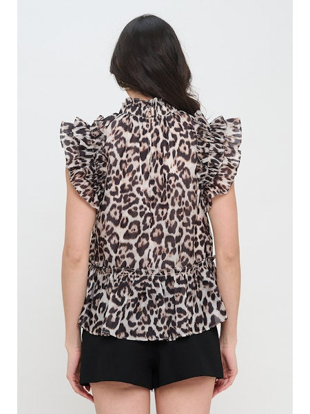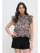 This top exudes bold elegance with its eye-catching print and delicate ruffle detailing. The high neckline and flutter sleeves add a touch of sophistication, while the lightweight fabric ensures effortless comfort. Perfect for pairing with tailored bottoms or casual denim, it brings a statement-making finish to any outfit.