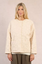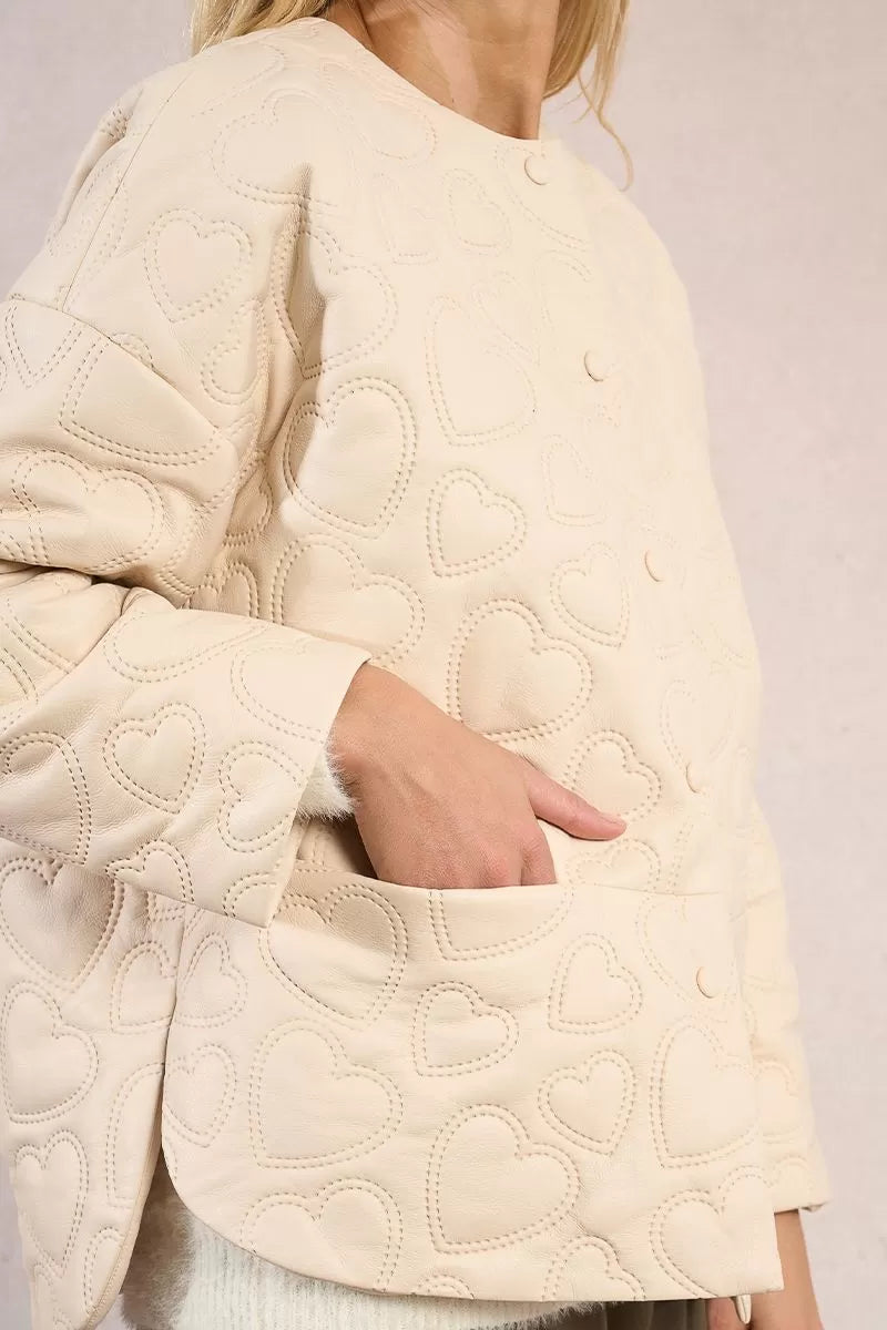 This quilted jacket stands out with its playful heart-embossed pattern, blending cozy charm with modern design. Crafted in a straight, oversized fit, it features a round neckline, covered button closure, and practical front pockets. Perfect for layering, it brings warmth and a touch of whimsy to everyday styling.