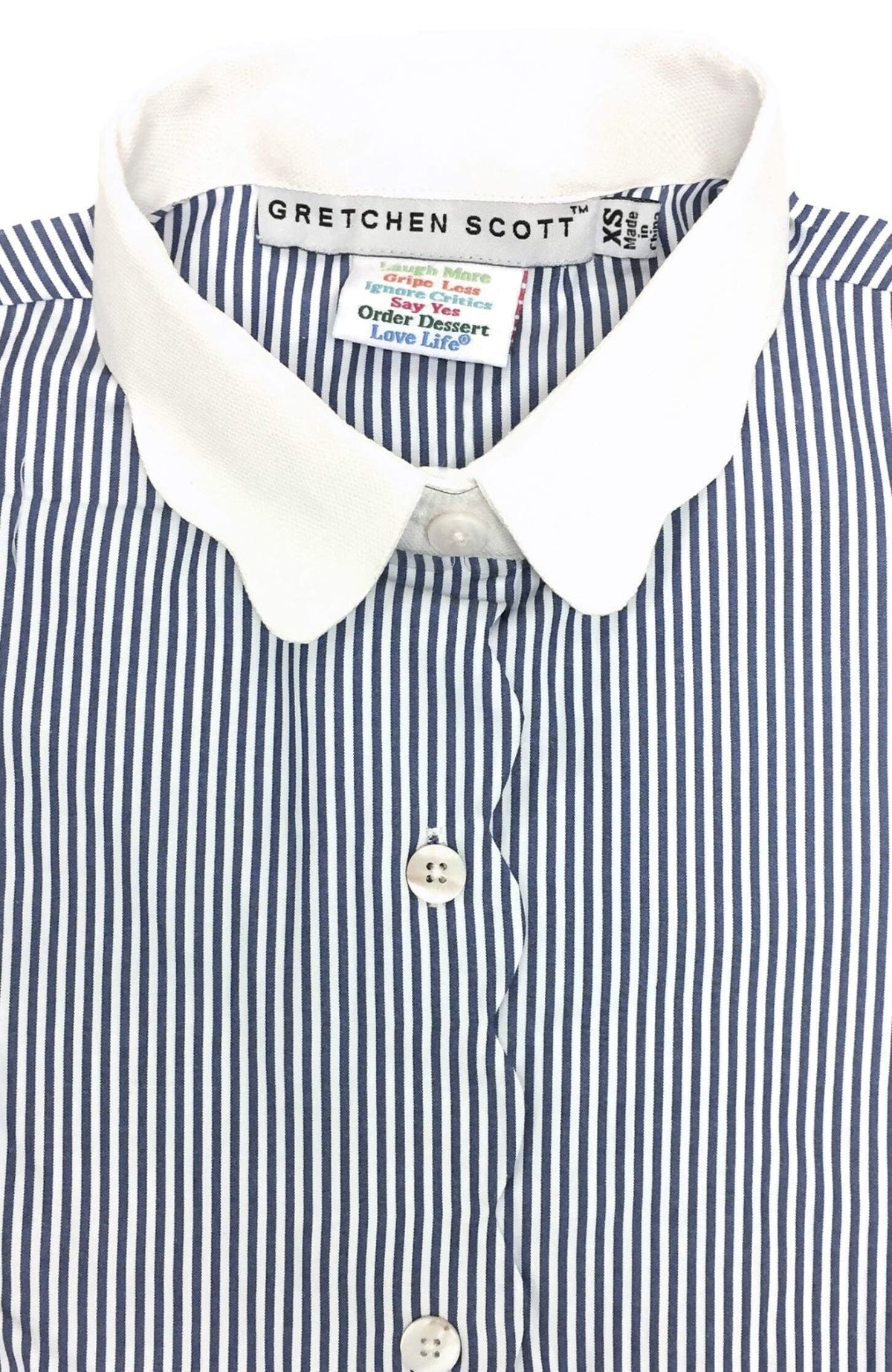This semi-fitted pinstripe shirt features a stylish 26" length and long sleeves with three-button cuffs for a polished look. The scalloped edges and pique collar and cuffs add a touch of sophistication, elevating its classic design. Perfect for both work and casual outings, this shirt combines comfort with a refined silhouette, making it a versatile addition to any wardrobe.