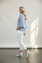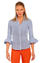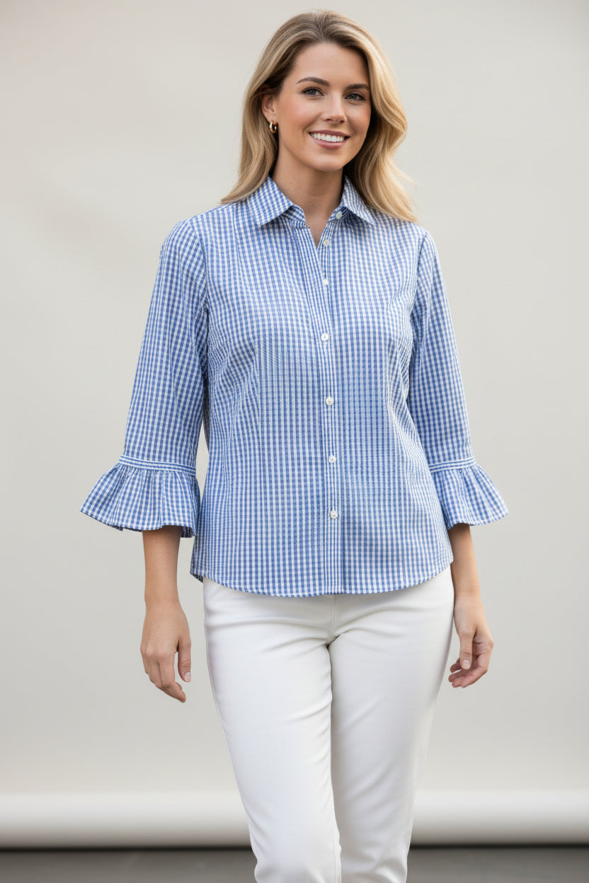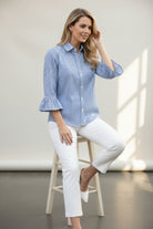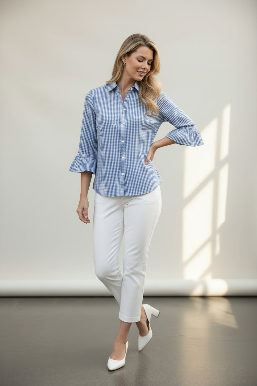 This semi-fitted blouse features ¾ sleeves with elegant ruffled cuffs, creating a refined and stylish look. Made from a soft cotton-poly blend, it offers comfort and breathability, perfect for all-day wear. The mother of pearl buttons add a touch of sophistication, while the contrast inside back panel enhances its visual appeal. With a length of 24" and machine washable fabric, this blouse is both practical and fashionable.
