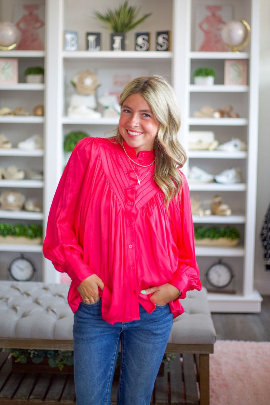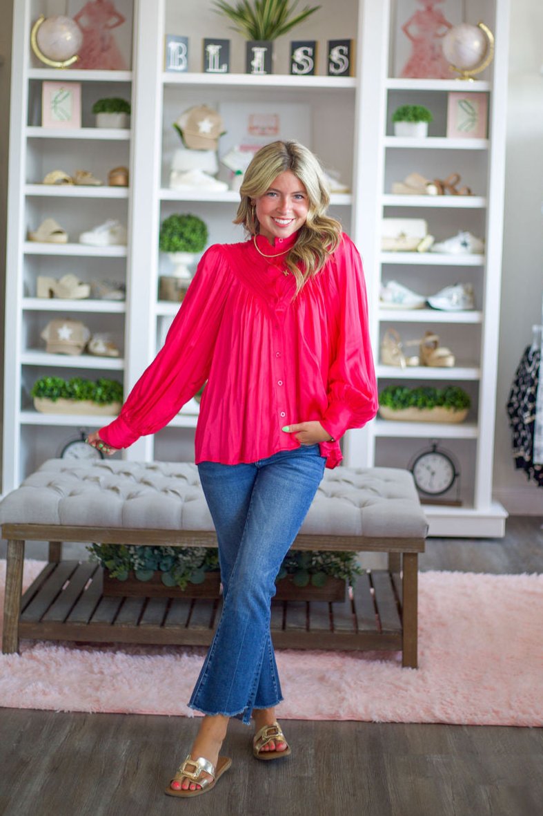 Slip into this silky Karlie top for a playful take on the classic button-up. Made with soft satin and pleated details, it's perfect for a casual brunch or a night out.