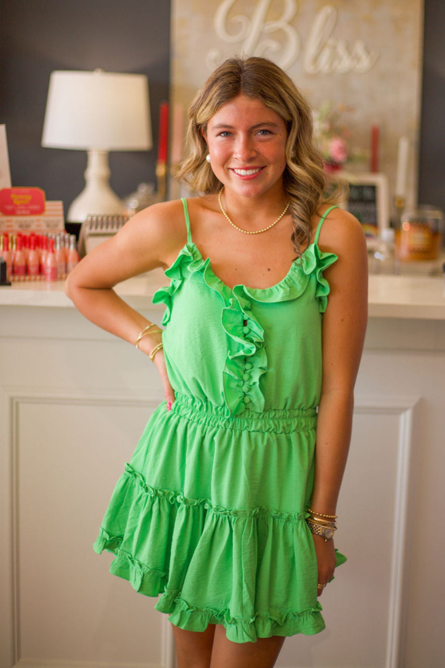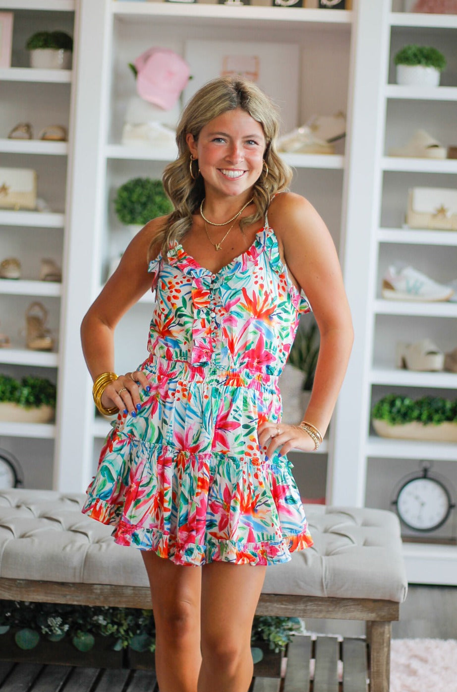 Get ready to turn heads in our Tropicana Ruffle Mini Dress! With spaghetti straps, a cinched waist, and adorable buttons, this dress is perfect for summer fun. The colorful pattern and tiered ruffles add a touch of cuteness to any outfit. Super cute? You bet!
