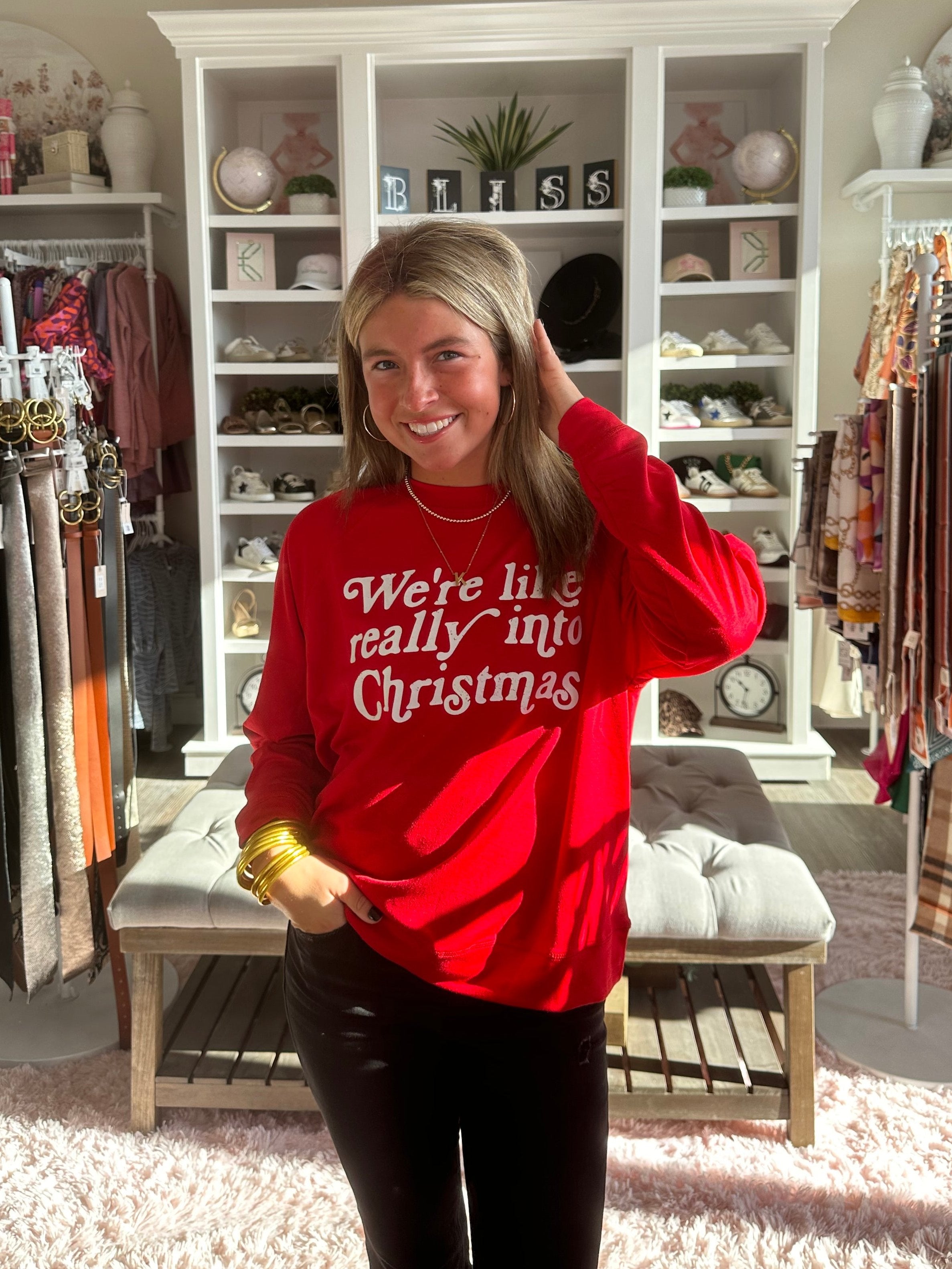 Get ready to sleigh the holidays with our We're Like Really Into Christmas Sweatshirt! This festive sweatshirt is perfect for showing off your love for all things Christmas. With its playful design and cozy material, it'll keep you warm and stylish all season long. Don't be shy, show off your Christmas spirit in style!