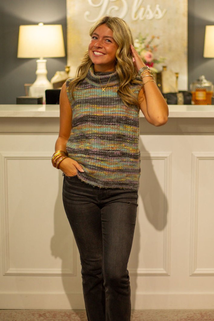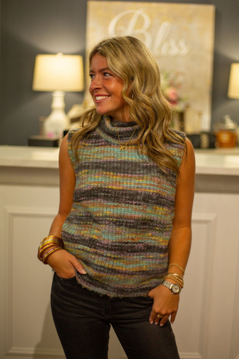 Ladies Knitted Sleeveless Sweater Grey with Multi-Colored Stripe
