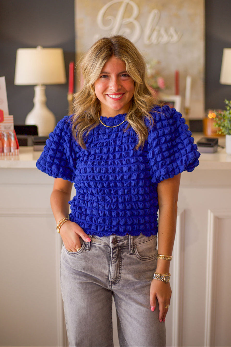 Royal Blue Popcorn Bubble Puff Sleeve Top