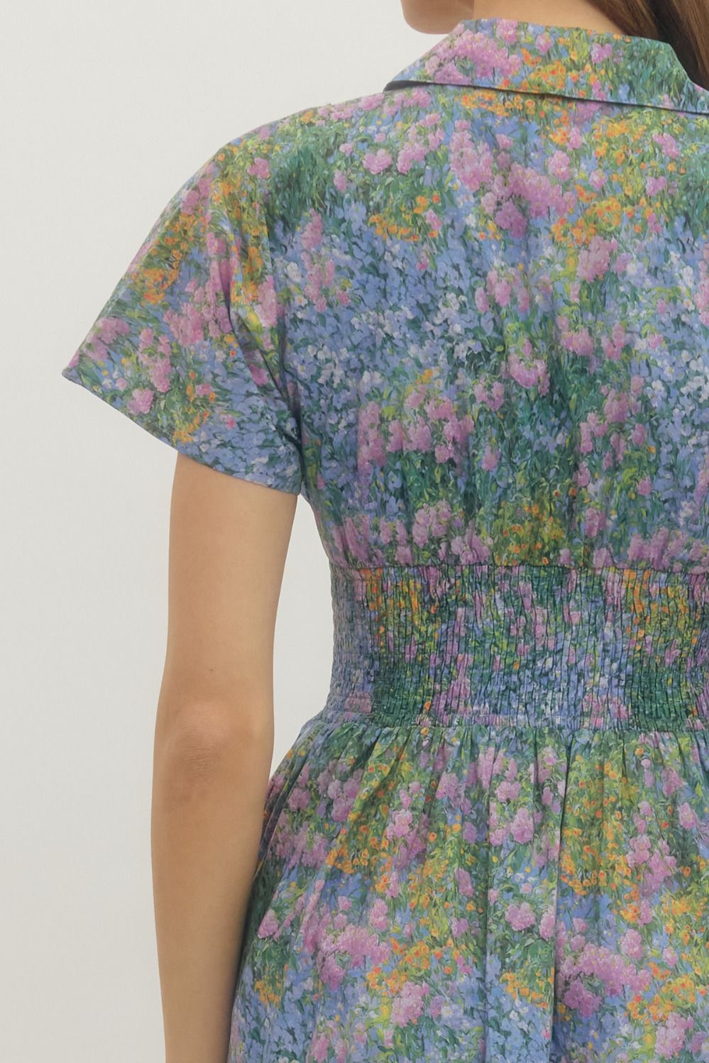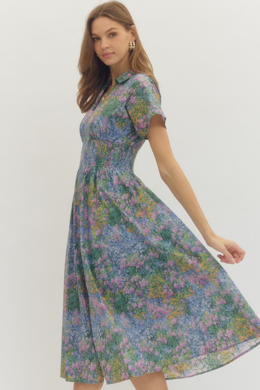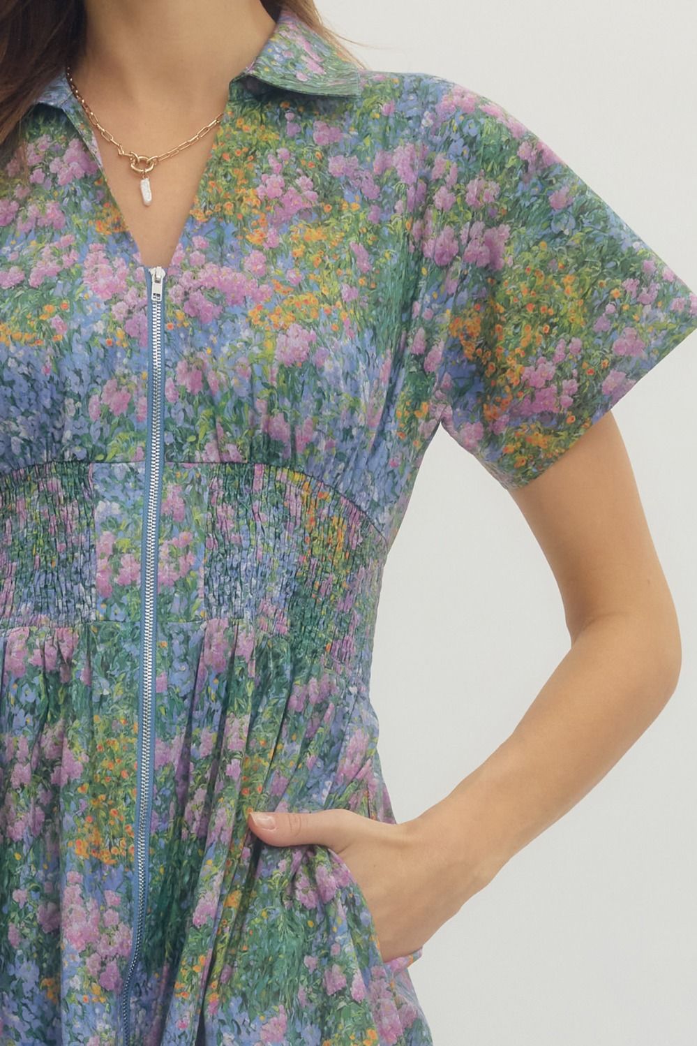 This dress combines comfort and style with its relaxed fit and beautiful floral print. The zip-up front and collared design offer a sophisticated touch, while the gathered waist provides a flattering silhouette. Perfect for a casual day out or a garden party, this dress is both functional and fashionable with its convenient pockets. Pair it with your favorite accessories for a chic, effortless look.