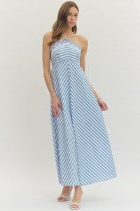 This chic maxi dress features a flattering strapless design with bold striped patterns that offer a modern yet relaxed vibe. The soft fabric ensures a comfortable fit, making it ideal for warm-weather occasions. Perfect for beach outings, casual gatherings, or evening dinners, this dress combines style and ease effortlessly. A versatile piece that pairs well with sandals or heels for any casual to semi-formal look.