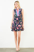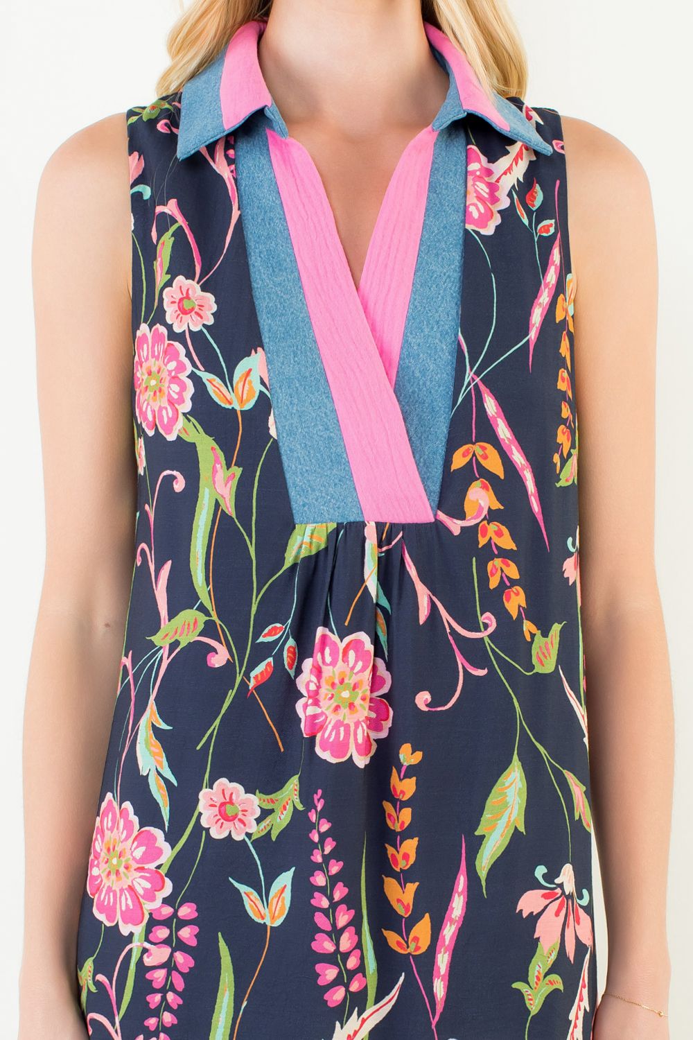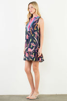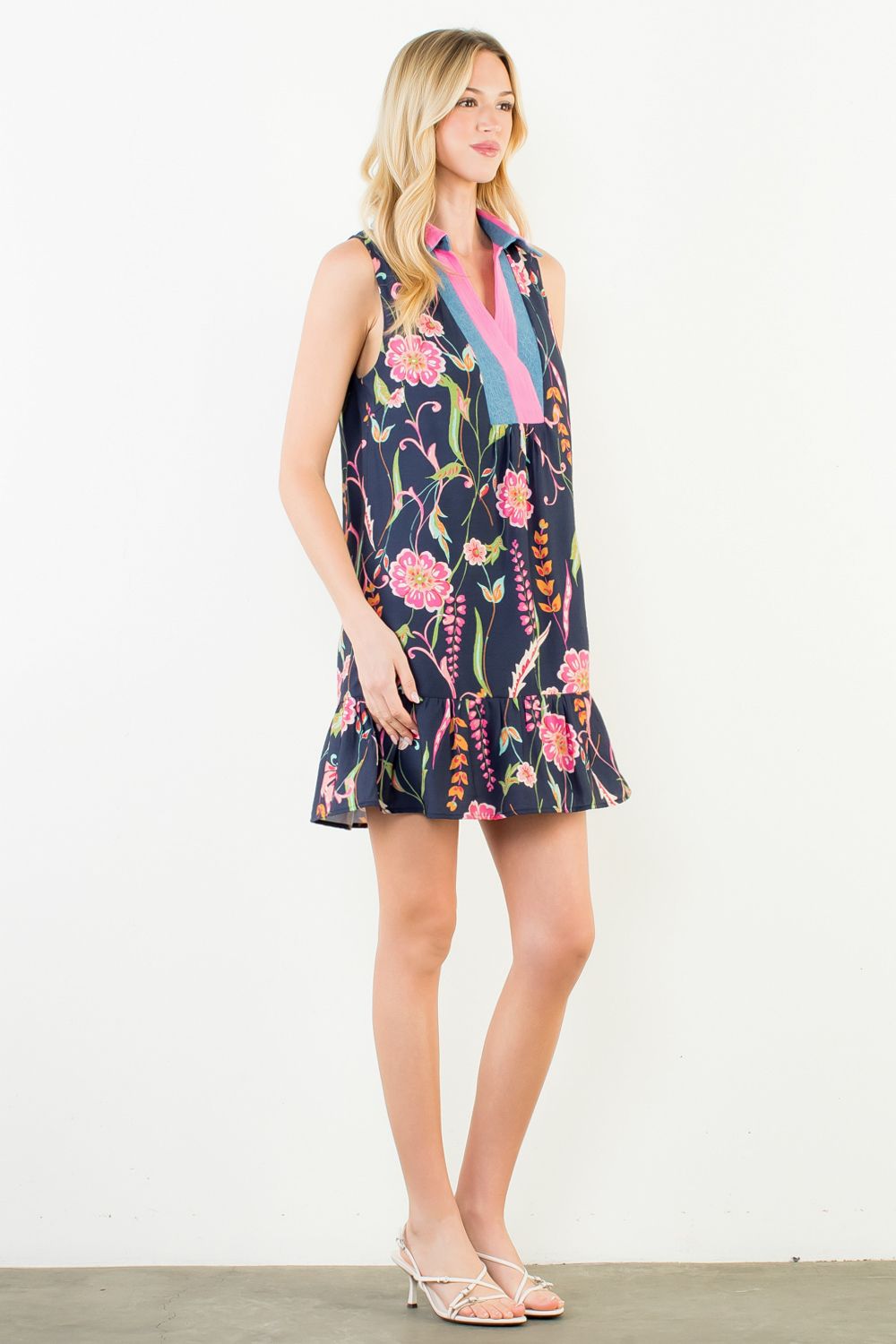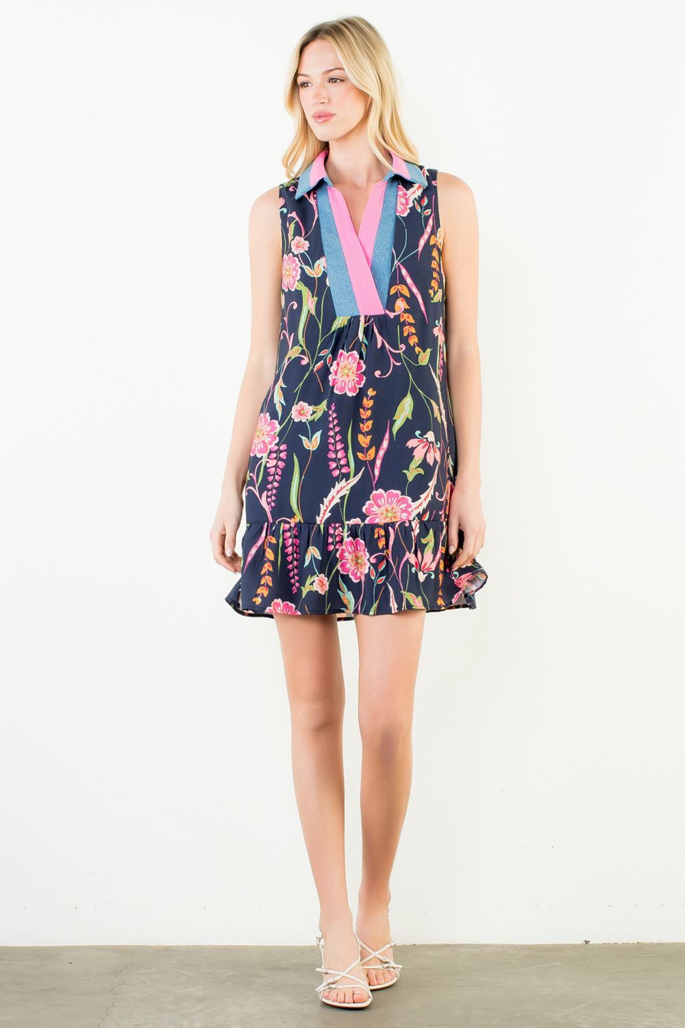 This sleeveless floral pattern dress combines bold, vibrant florals with a flattering V-neckline for a fun and stylish look. The unique mix of colors, along with a playful ruffled hem, makes it perfect for warm-weather outings, offering both comfort and standout style. A versatile dress that effortlessly transitions from day to evening wear.