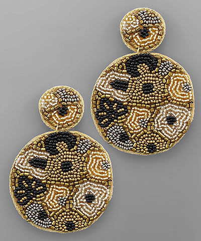Make a bold and sophisticated statement with these intricately beaded disc earrings. Featuring a captivating pattern in shades of gold, black, and white seed beads, these oversized circular drops are designed to catch the light and add a touch of artisanal elegance to any ensemble. Perfect for evening wear or to elevate a daytime look.