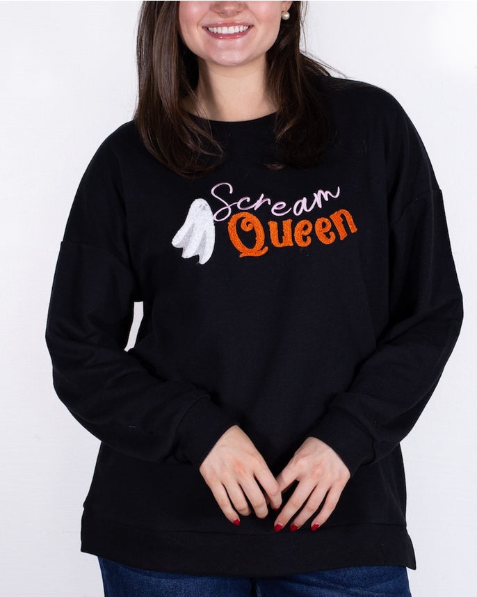 Embrace spooky season in cozy style with our Scream Queen Sweatshirt. This soft black pullover features playful embroidered lettering and a cute ghost graphic, making it a fun and festive addition to your fall wardrobe. Designed with an oversized fit for ultimate comfort, it’s perfect for lounging, layering, or heading out to your favorite haunted happenings. Stick with your usual size for a relaxed look, or size down for a more fitted feel.