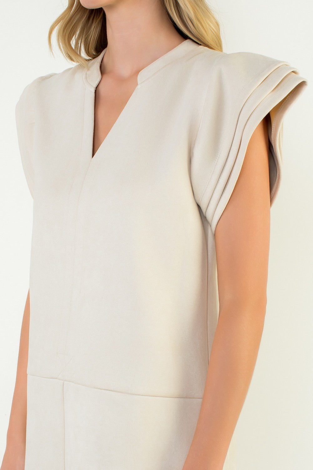 This suede mini dress combines a sleek, modern look with timeless style. The flutter sleeves and V-neck add a touch of femininity, while the soft fabric ensures comfort throughout the day. Its minimalist design and flattering fit make it perfect for both casual and dressier occasions. Pair it with heels or flats for an effortlessly chic ensemble.