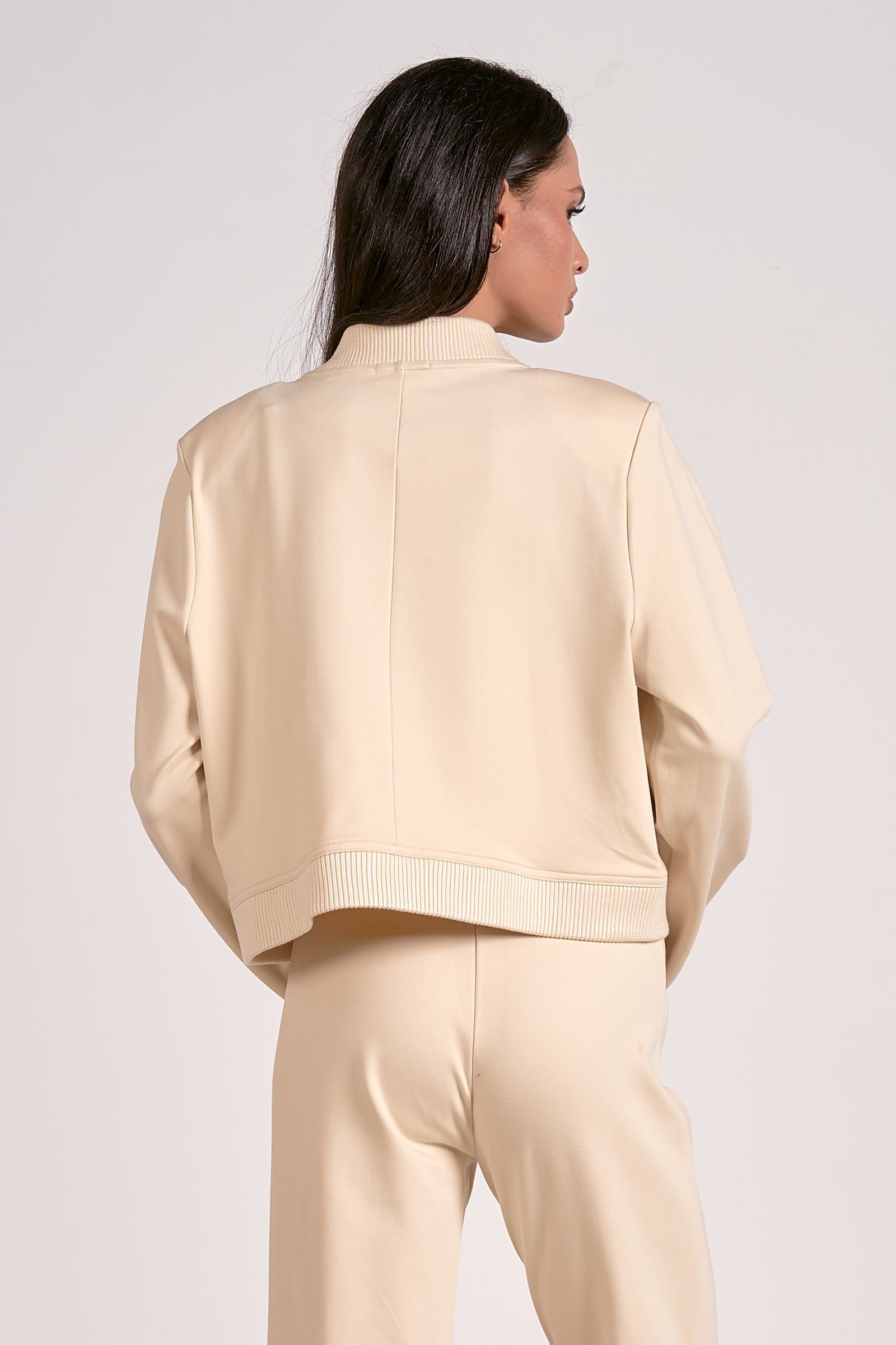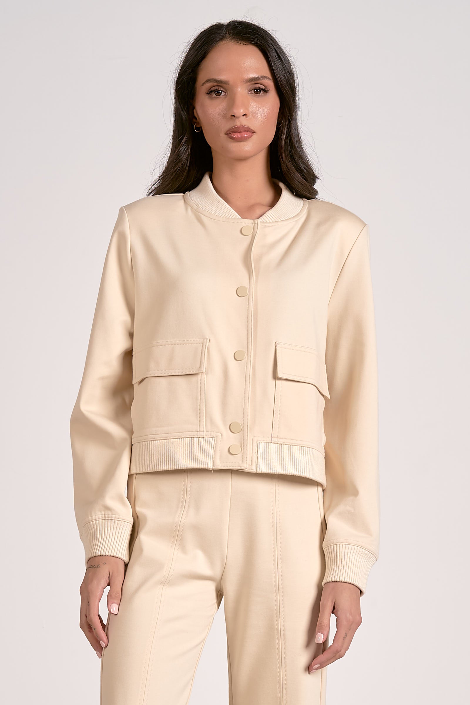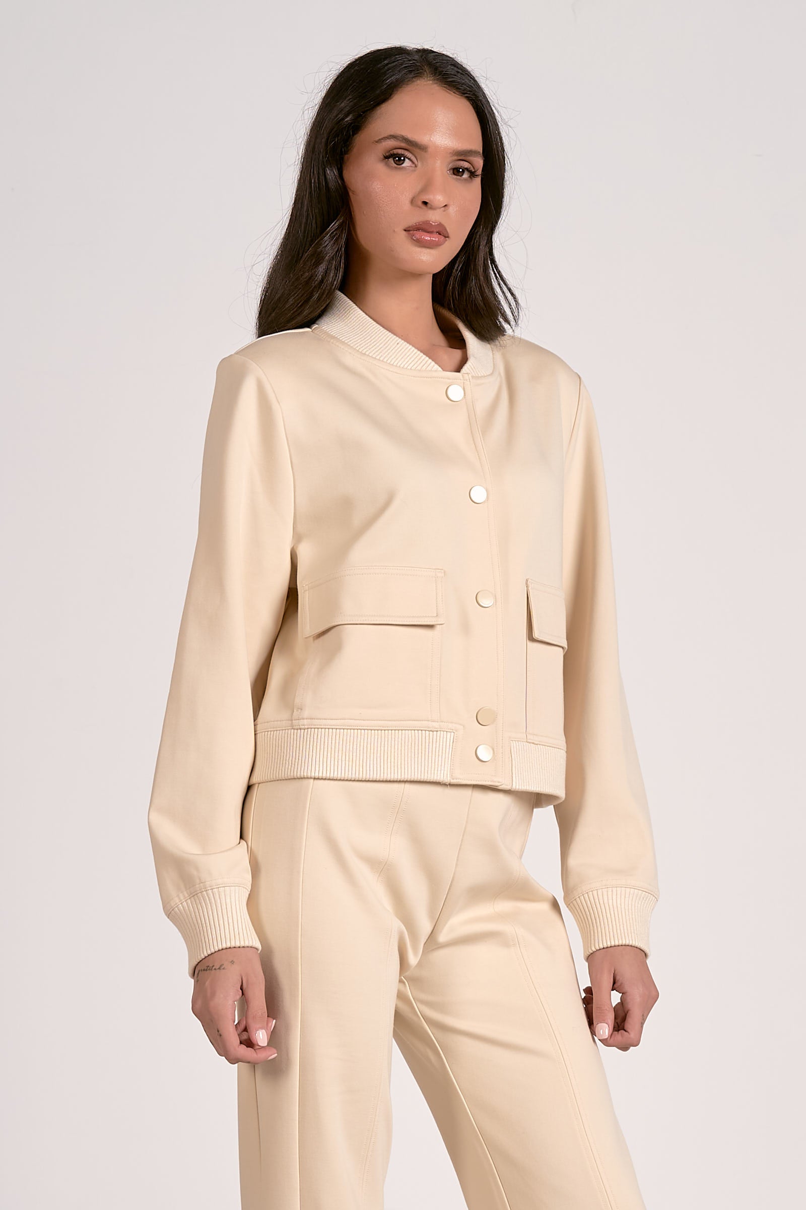 This bomber jacket combines a modern, structured silhouette with casual ease, making it a versatile staple for everyday wear. Featuring flap pockets and ribbed trim, it delivers both function and style. Whether layered over dresses, denim, or tailored pants, it brings a polished yet relaxed finish to any outfit.