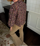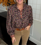 A lightweight long sleeve top adorned with an all-over leaf print in rich, earthy tones. The buttoned neckline and gathered collar add a refined touch, while the contrasting cuffs bring a pop of detail. A versatile piece that transitions seamlessly from casual wear to polished looks.