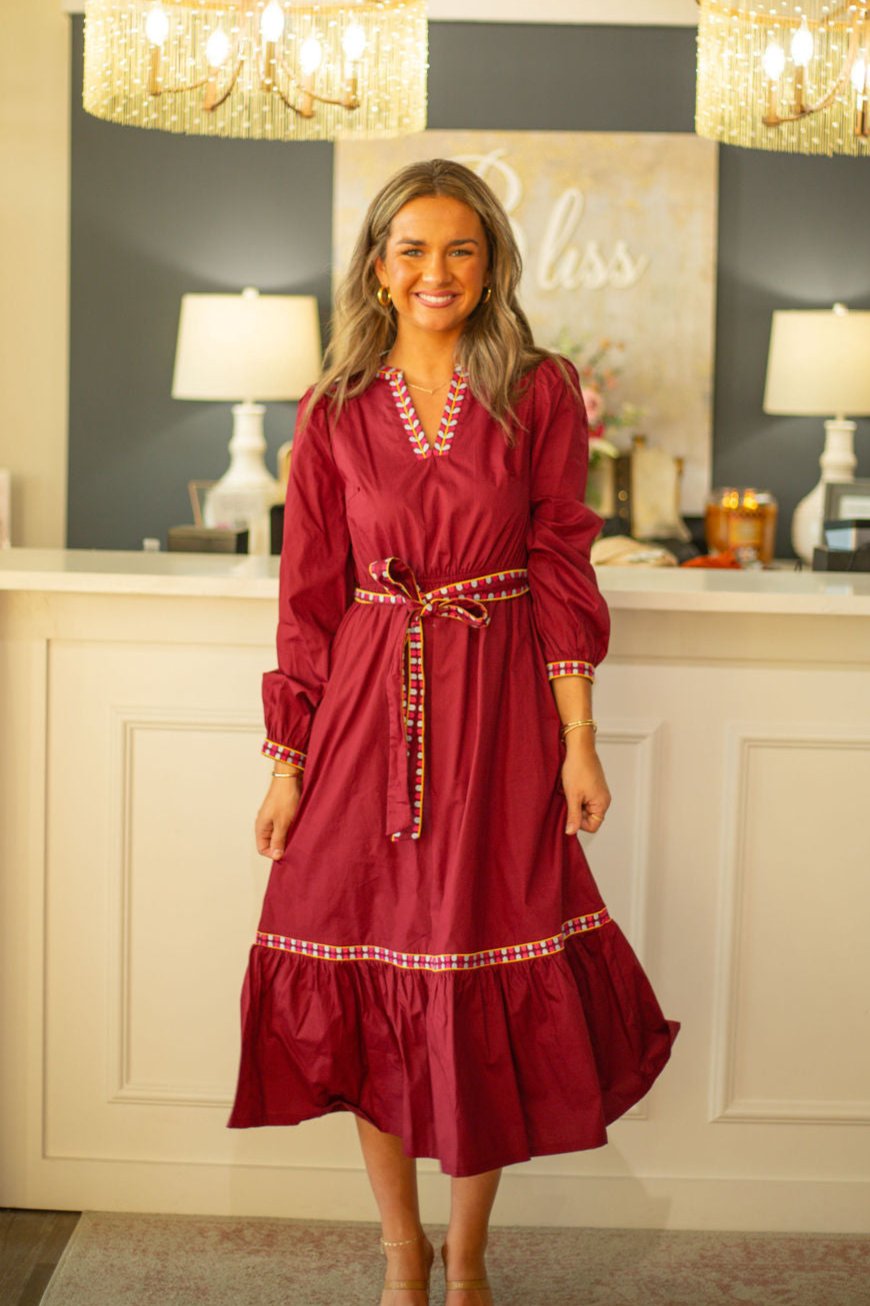 Add a pop of color to your wardrobe with our Embroidered Dress by &Merci! This burgundy dress features stunning pink and light blue embroidery, and a flattering v-neck. Look stylish and feel comfortable all day long. Upgrade your outfit game with this playful piece!