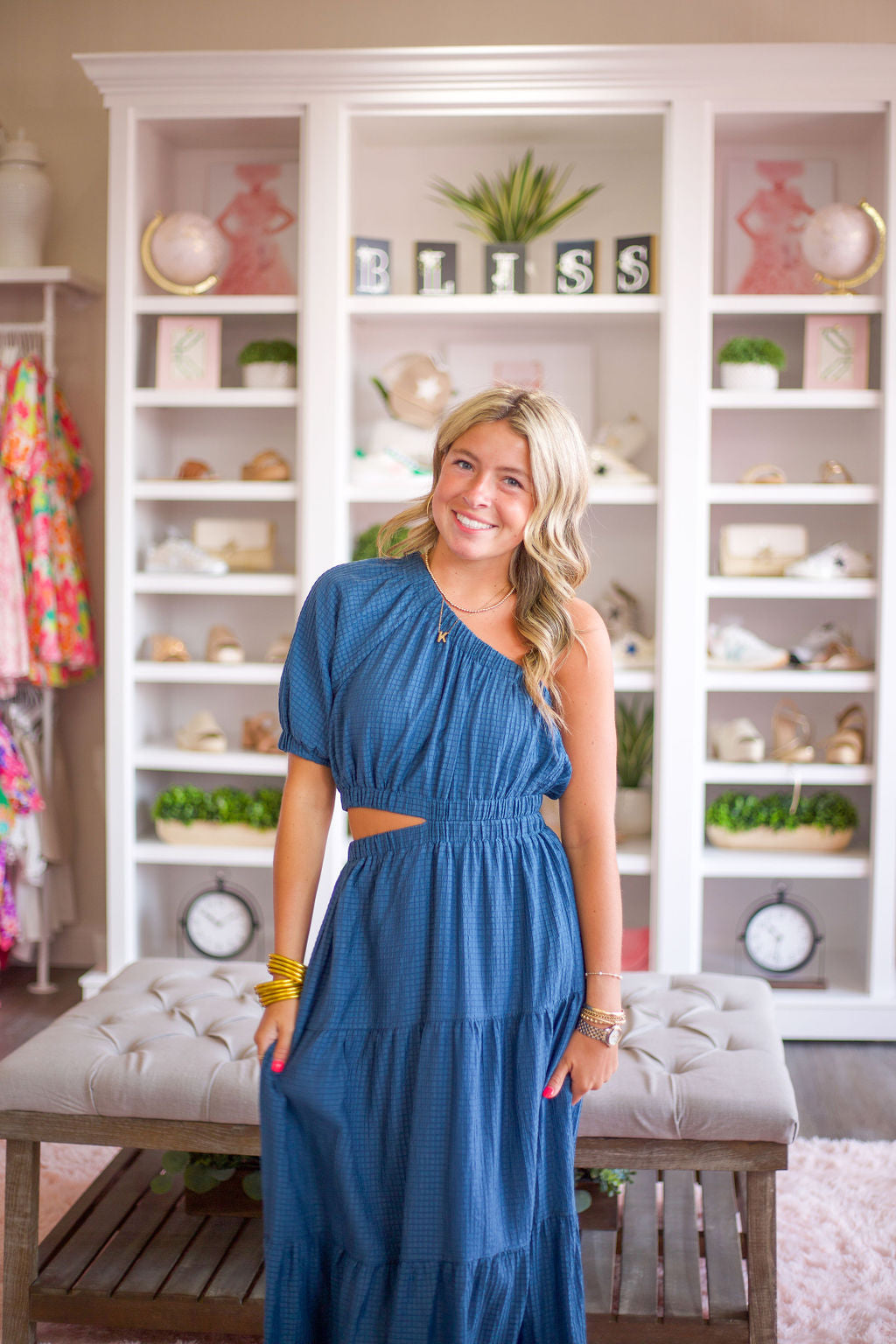 Get ready to turn heads in our Navy One Shoulder Dress! This versatile midi dress features a unique cut out design and a textured fabric, making it a best seller. Perfect for any occasion, this dress is both beautiful and functional. Upgrade your wardrobe and stand out in style with this one shoulder stunner.