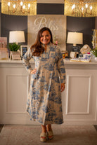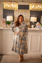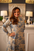 Discover timeless elegance with a sophisticated garment that harks back to classic artistry. This beautiful dress showcases a serene toile de Jouy pattern, featuring intricate scenic vignettes that evoke a sense of peaceful charm and refined grace. Designed with a flattering midi length and a comfortable, flowing silhouette, it's an ideal choice for adding a touch of vintage-inspired beauty and understated luxury to your collection.