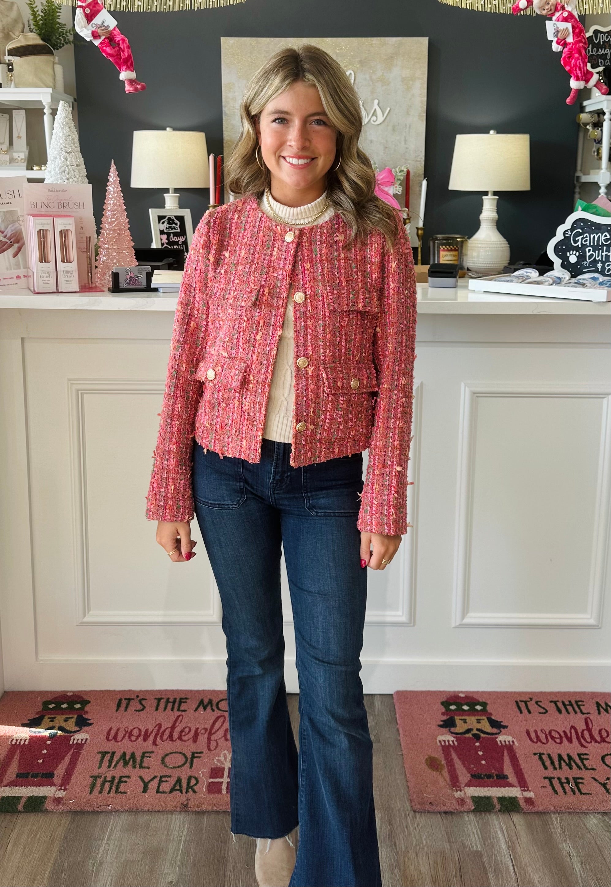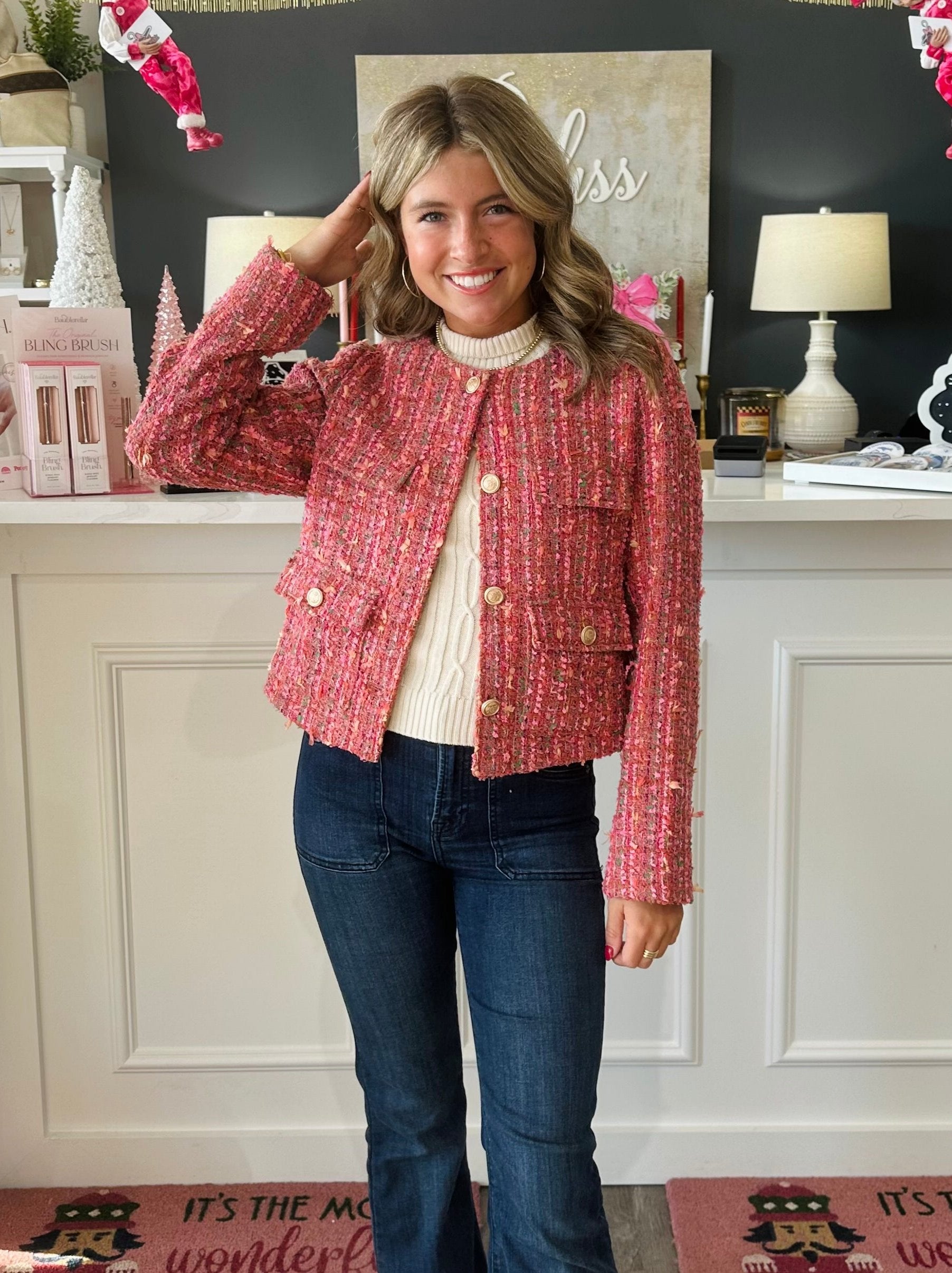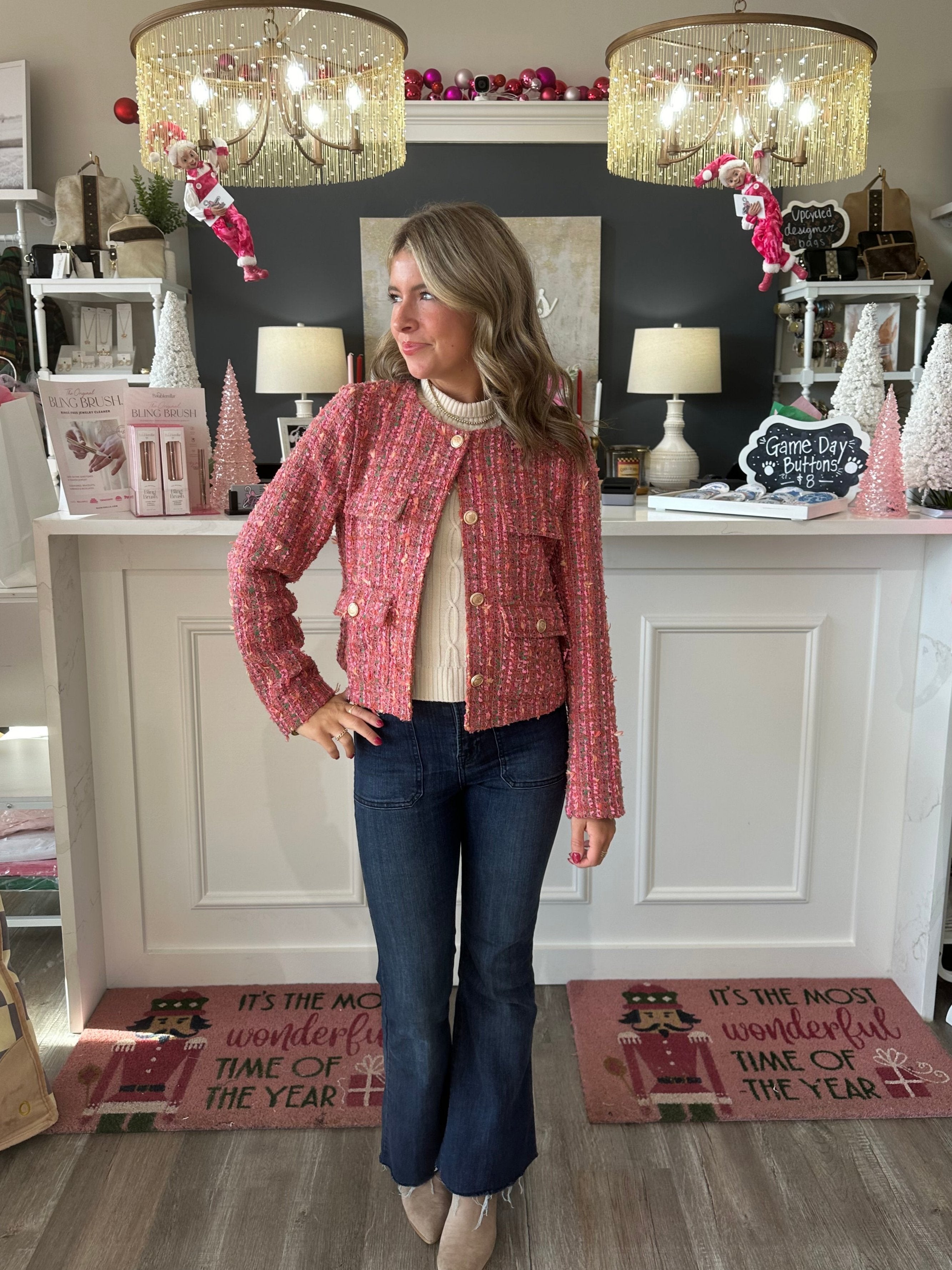 Introducing the Pink Multi Color Tweed Jacket, a stylish addition to your wardrobe. Made with high-quality tweed fabric, this jacket offers both durability and sophistication. Its unique multi-color design adds a pop of color to any outfit. Elevate your style and make a statement with this must-have jacket.