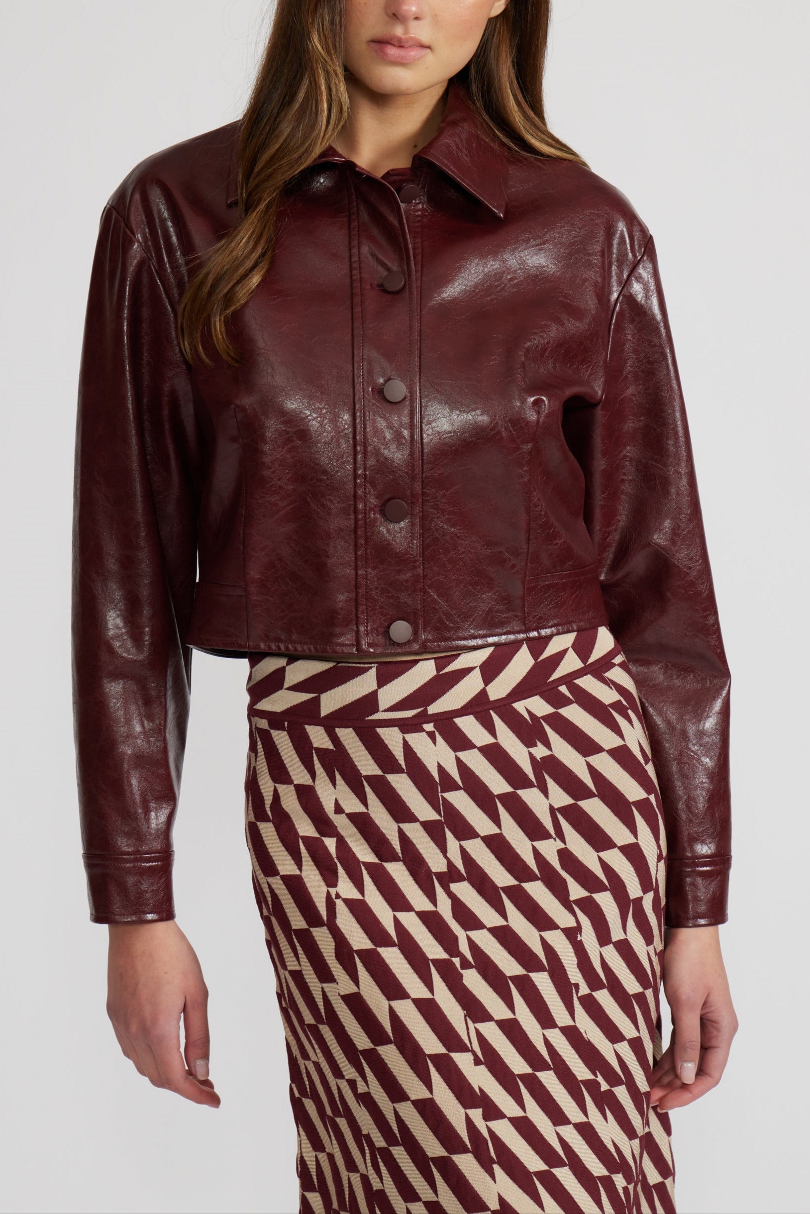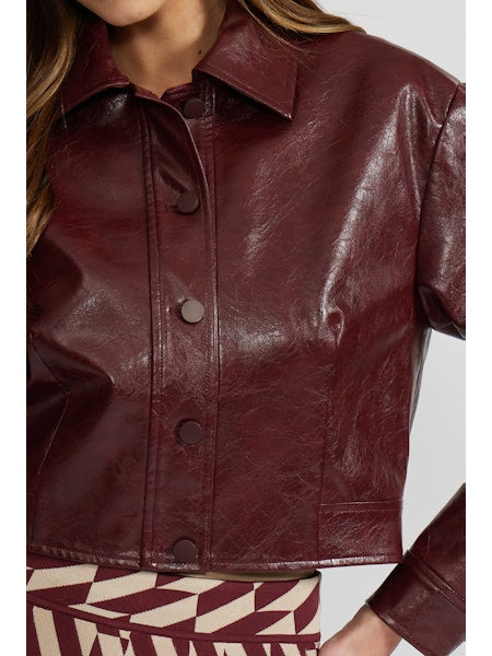 This jacket delivers a sleek and modern edge with its structured silhouette and smooth faux leather finish. Designed with a classic collar and button-down front, it pairs timeless tailoring with contemporary appeal. A versatile staple, it layers effortlessly over dresses, skirts, or denim, making it a must-have piece for any wardrobe.