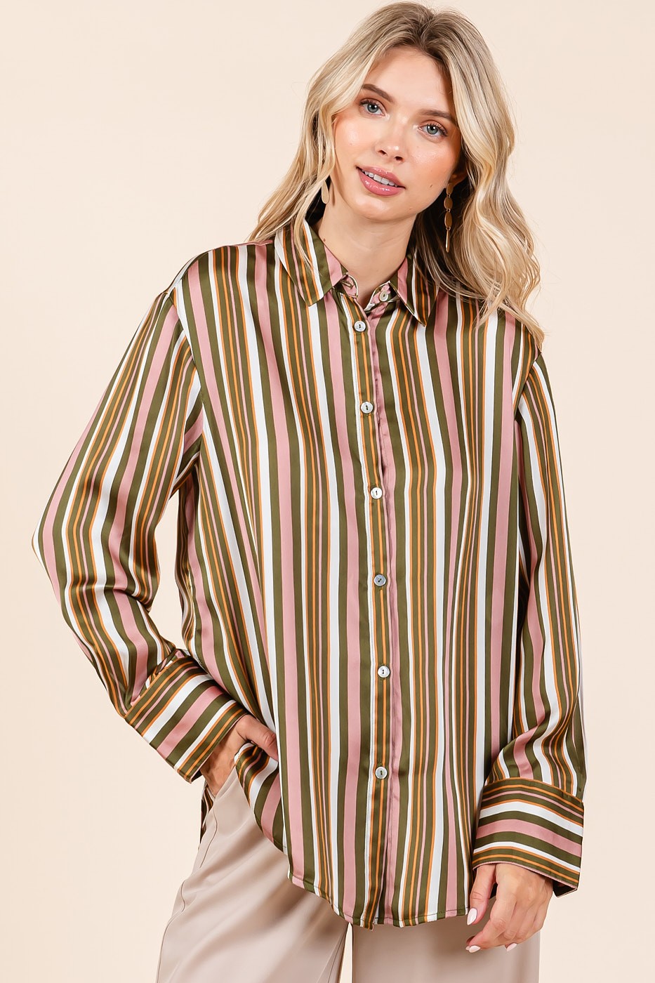 Get ready to layer up in style with our Multicolor Striped Print Satin Button Down Shirt! This vibrant and playful blouse is perfect for any occasion. The colorful stripes add a fun touch, making it a great option for both casual and dressy looks. Plus, the soft satin material ensures you'll be comfortable all day long.