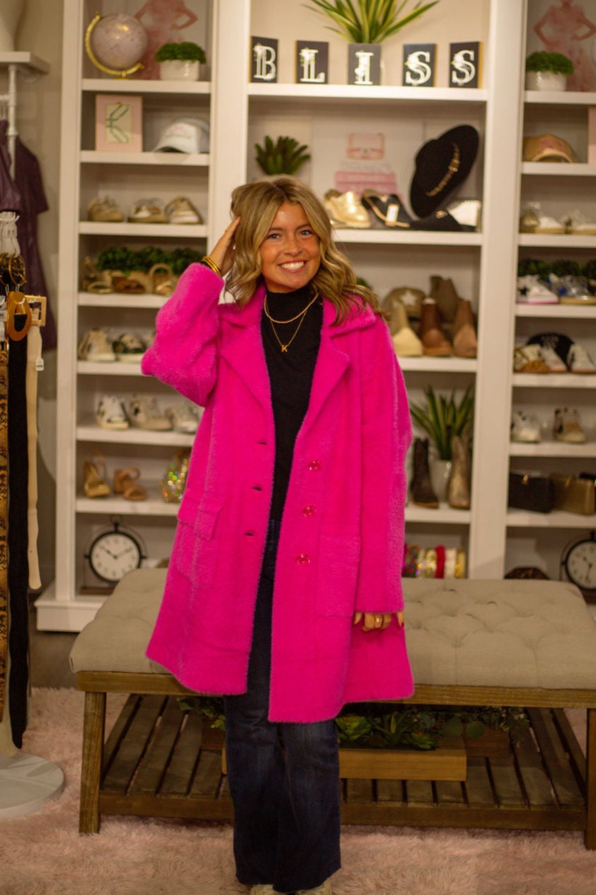 Stay warm and stand out in this hot pink sweater coat. Be a trend setter with this eye-catching piece - perfect for adding a pop of color to any outfit. Stay stylish and cozy in this one-of-a-kind sweater coat.