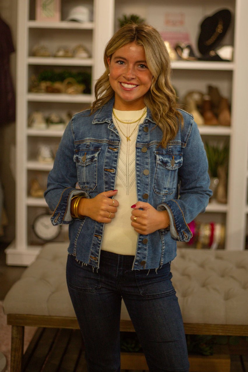 This Kut from the Kloth Base Washkara Jacket is a must-have with a raw hem waist for added edge. The perfect addition to your wardrobe, this jacket is sure to turn heads with its unique design and flattering fit. Dress it up or down, this jacket is the ultimate versatile piece!