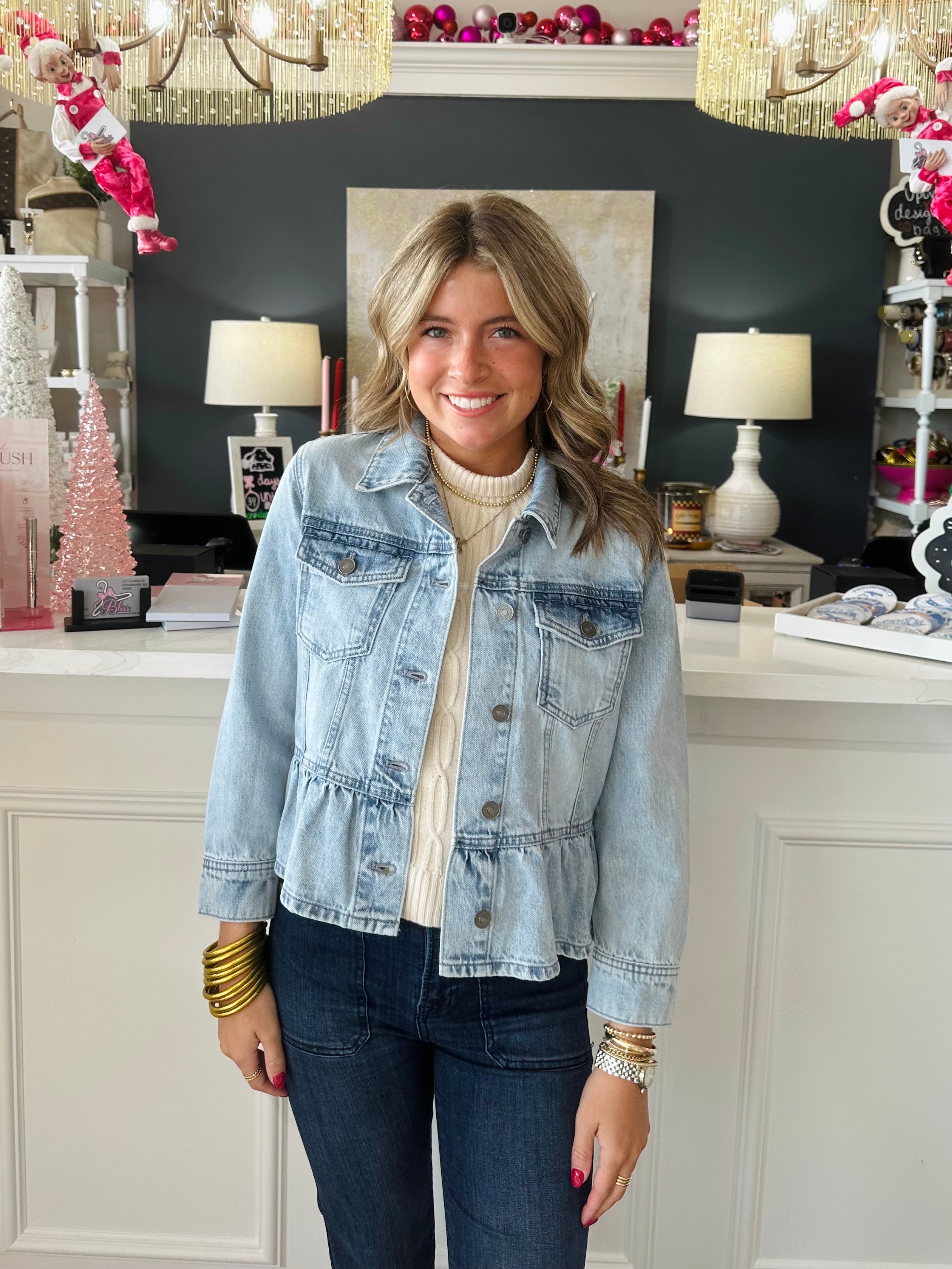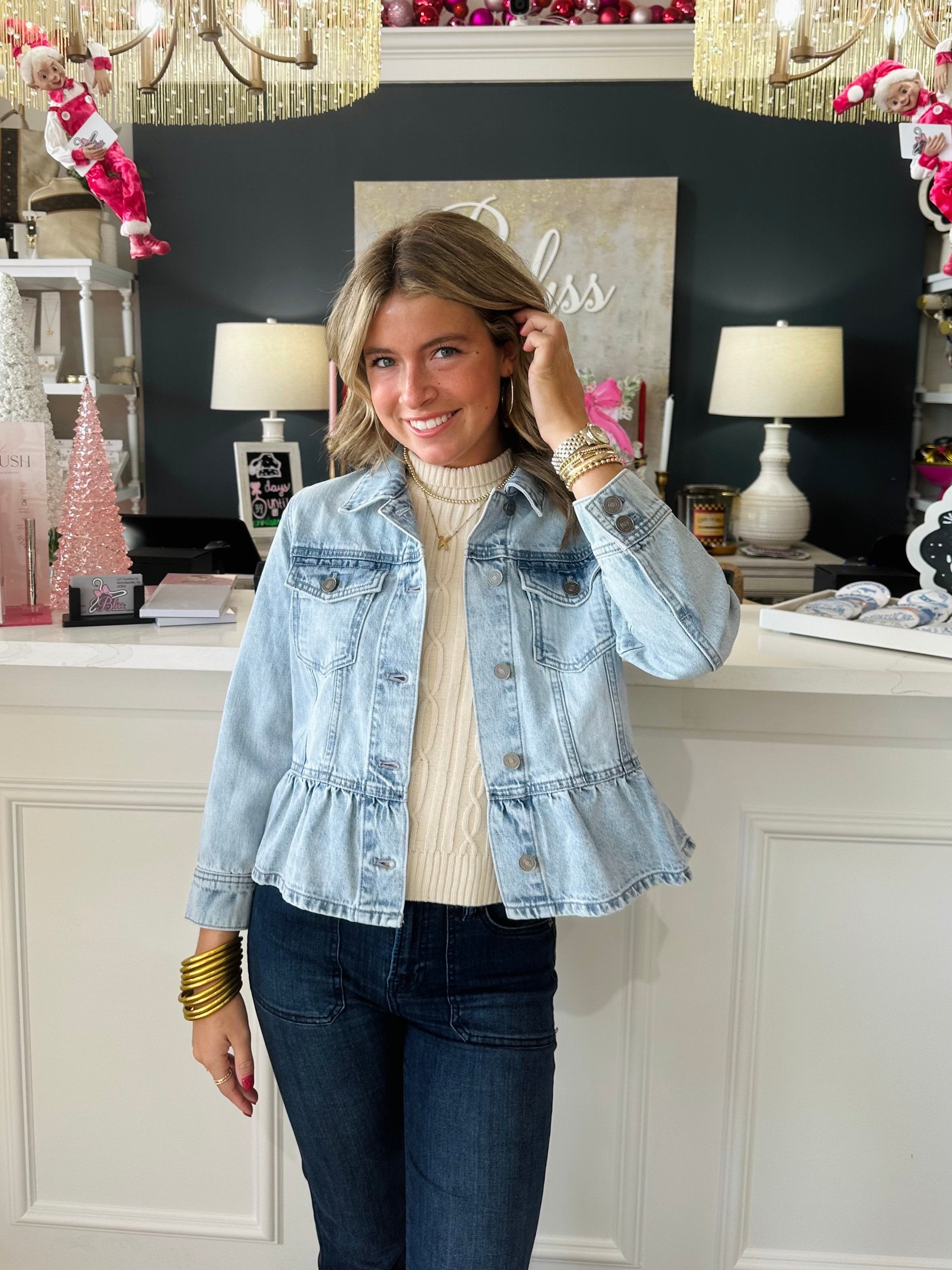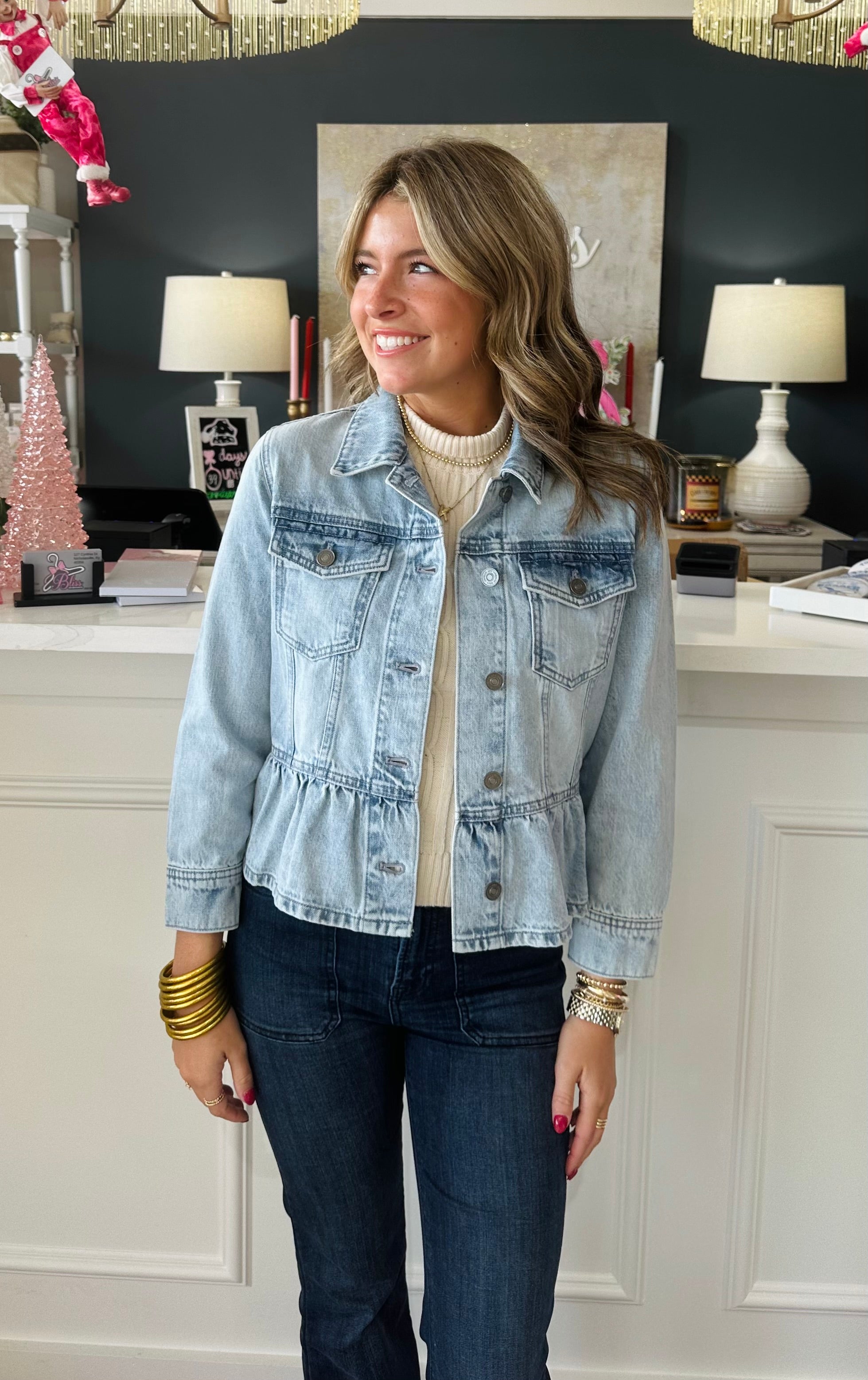 Introducing the Classic Fit Peplum Denim Jacket - the perfect addition to any wardrobe. Made with a classic fit and peplum design, this jacket is both stylish and flattering. Made from high-quality denim, it offers both comfort and durability. Elevate any outfit with this must-have jacket.