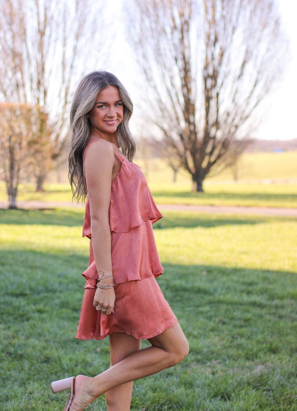 This Almond Breeze A-Line Dress features a knee-length design with shoulder straps, perfect for any casual or dressy occasion. Made from 100% polyester, it's not only stylish but comfortable as well. The beautiful color and layered silky material add elegance to any outfit.