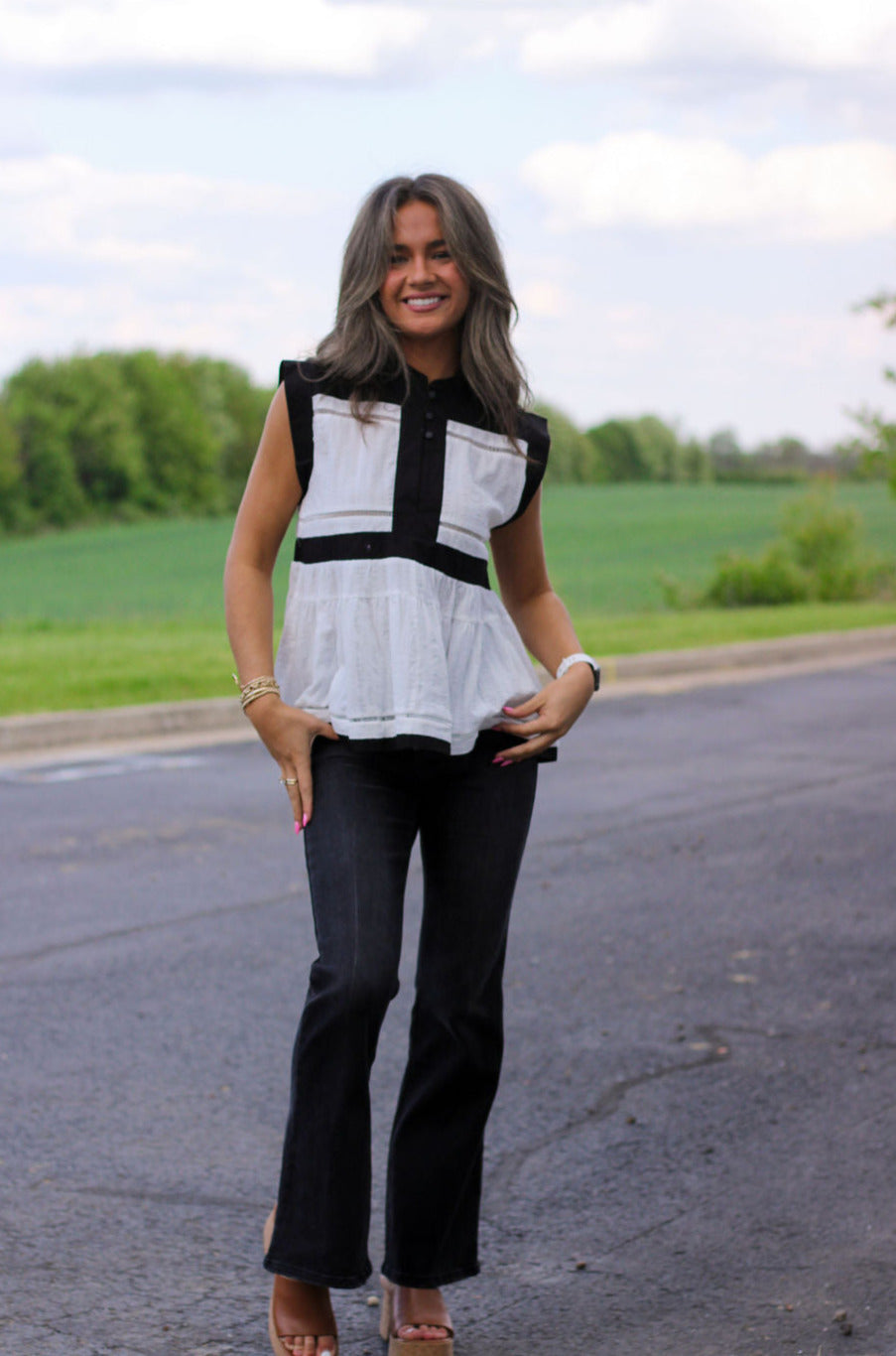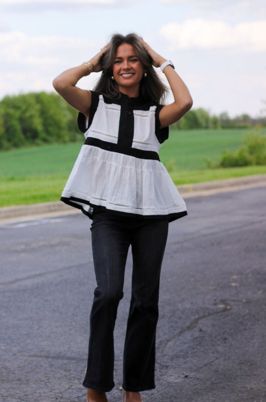 Elevate your style with the Contrast Combo Top. This sleeveless blouse features a sophisticated high collar and front button detailing for a polished look. The contrast trim and textured fabric add a touch of elegance while the babydoll design and flare hemline offer a flattering silhouette.