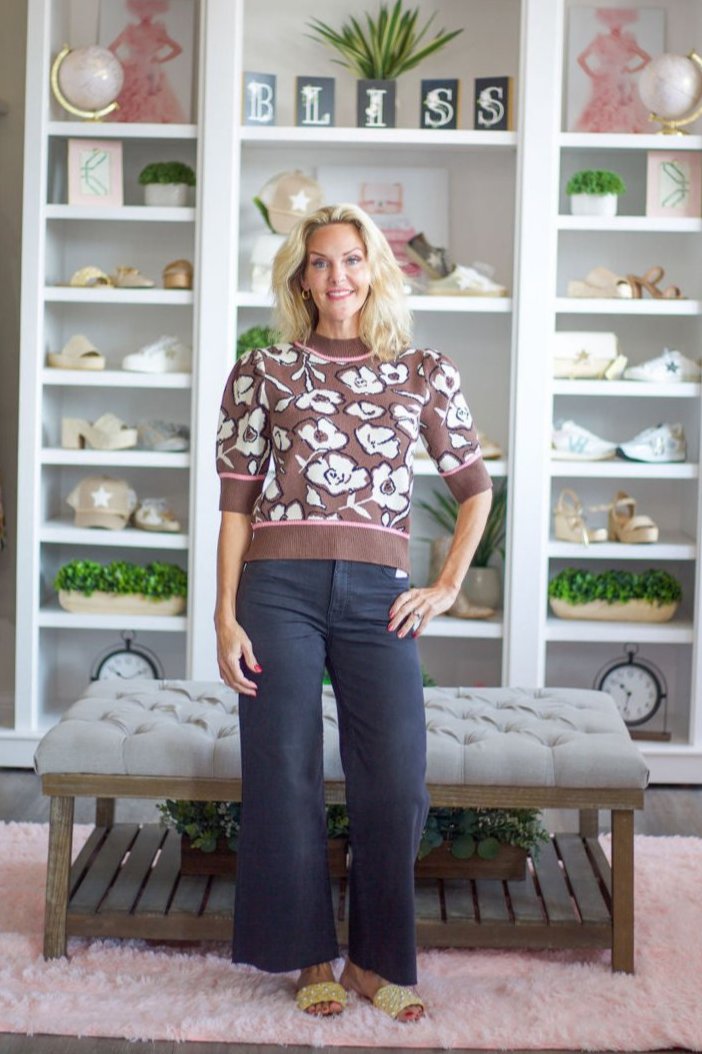 Add a touch of flower power to your wardrobe with this Flower Knit Short Sleeve Top! The brown base color is adorned with charming white flowers and pink shirt trim, making it the perfect playful addition to any outfit. Made by THML, this top is both stylish and comfortable. Get ready to bloom with this quirky and fun top!