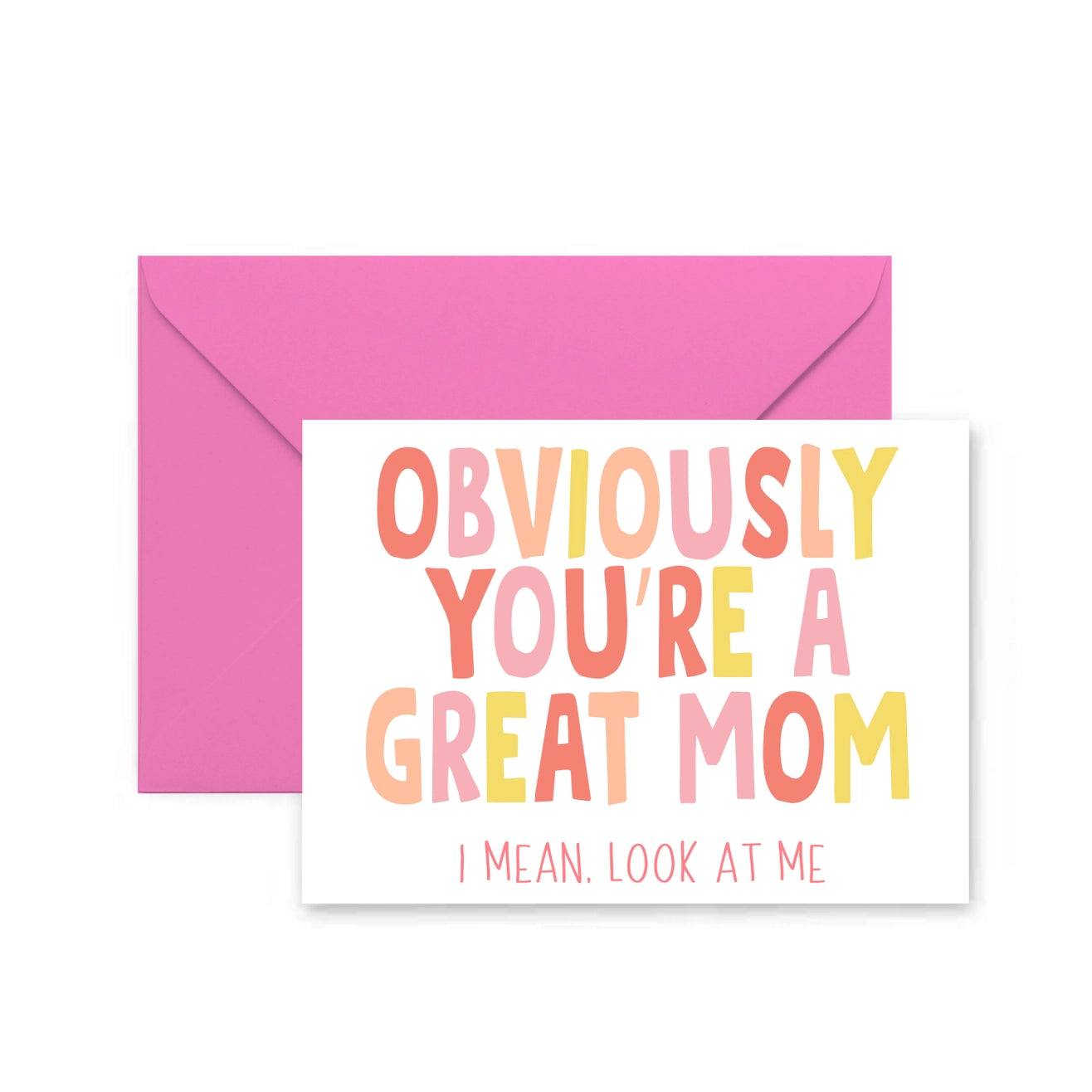 Show your mom some love with our Great Mom greeting card! With its quirky and colorful design, this super cute card is sure to make her smile. Plus, its playful message ("Obviously you're a great mom, I mean, look at me") will remind her just how awesome she is. Perfect for any occasion, from Mother's Day to her birthday!
