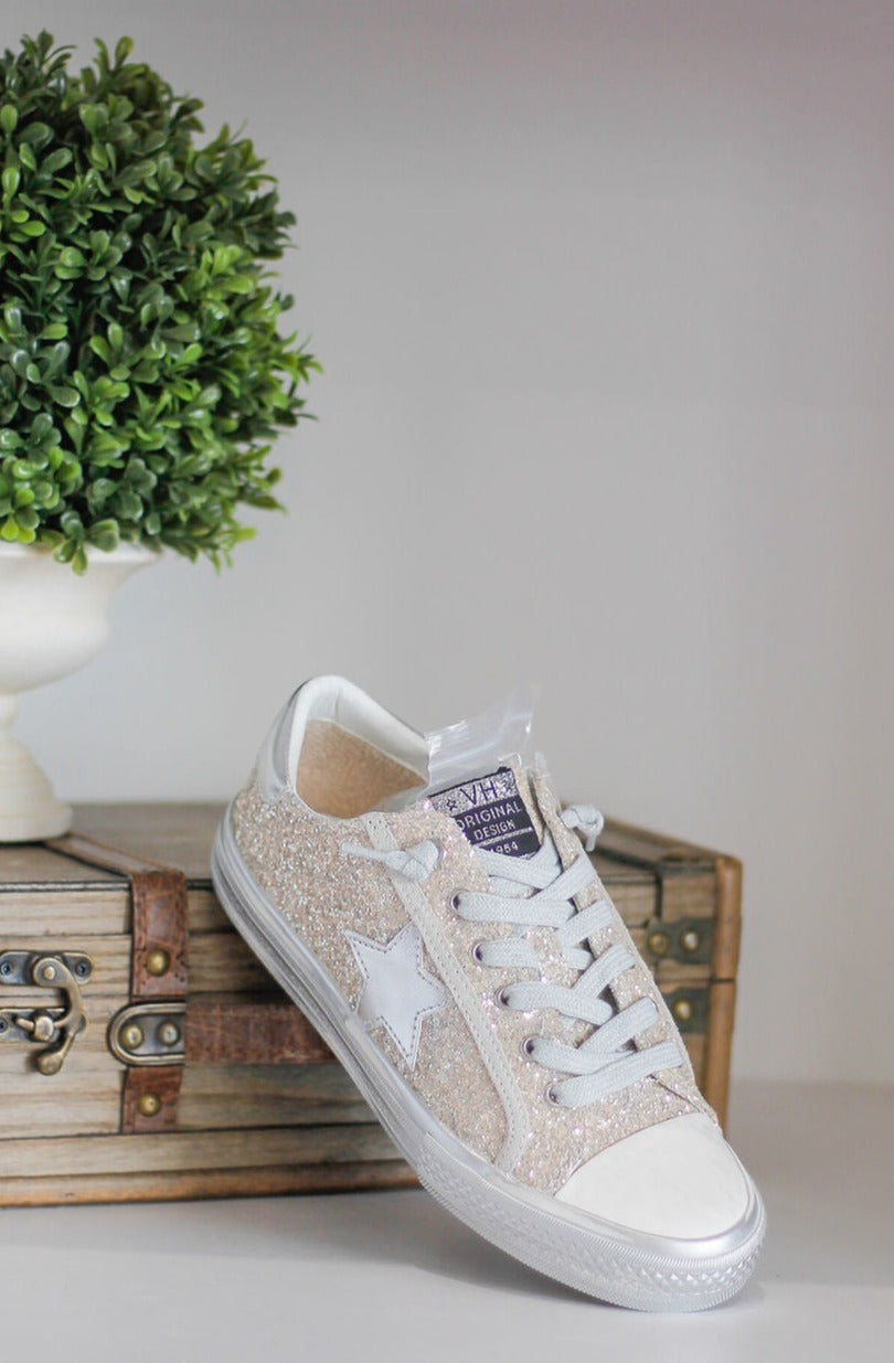 Add a pop of sparkle to your sneaker game with these Vintage Havana Chunky Gold Glitter Silver Star Low Tops. The chunky design and silver star accents give off a vintage vibe, while the gold glitter adds a touch of glam. Perfect for adding some fun to your casual look!