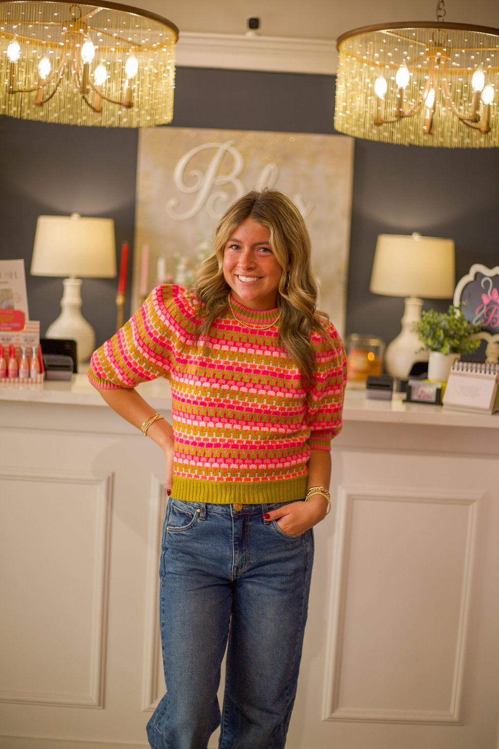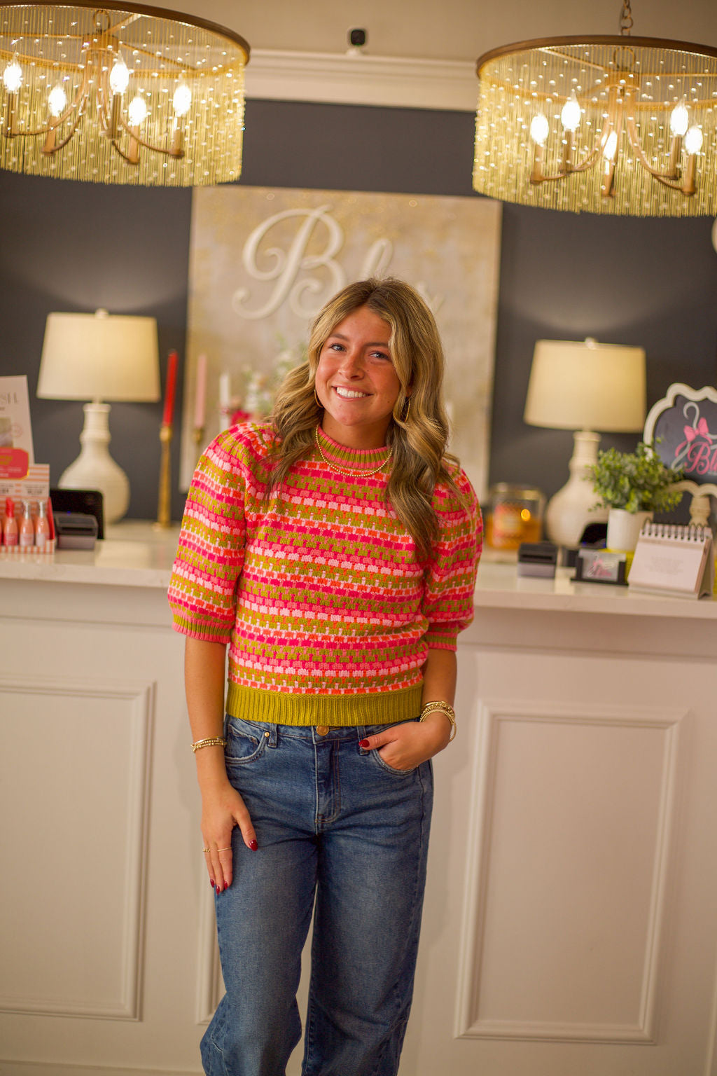 Add a playful pop of color to your wardrobe with the Short Sleeve Knit Top by THML. Stay cool and stylish in this colorful top that will brighten up any outfit. Perfect for a fun and quirky look!