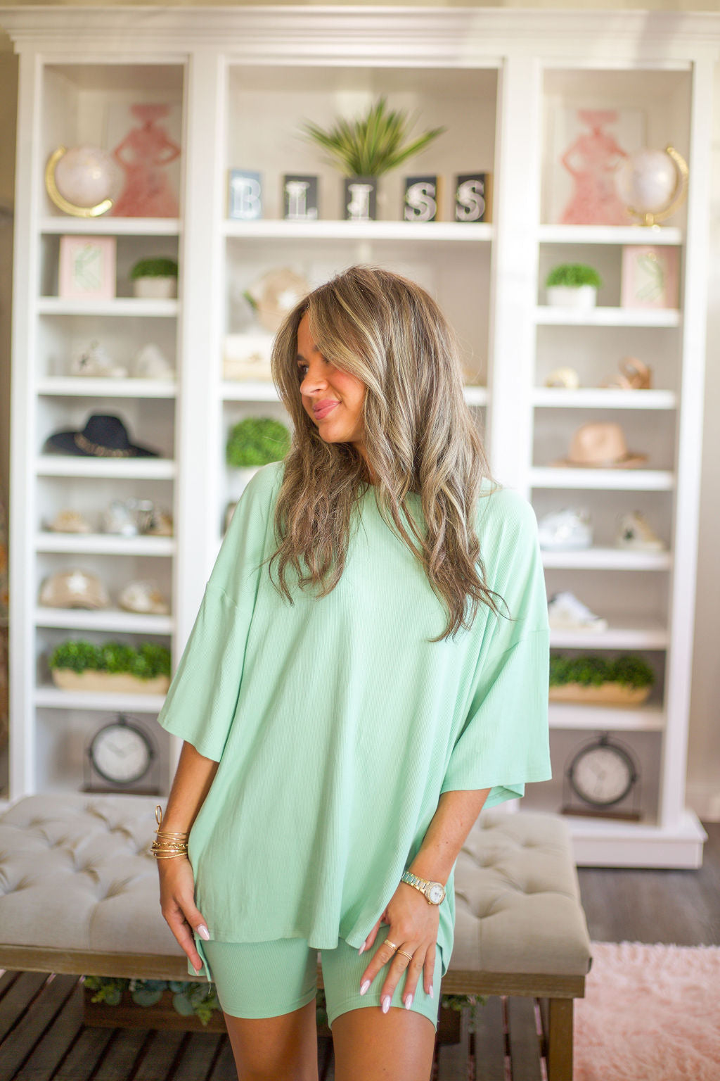 Get ready to lounge in style with our Karlie Ribbed Bike Short Set! Featuring matching biker shorts and an oversized top, this set is perfect for those lazy days. The muted sage green color and ribbed fabric add a touch of subtle texture. Don't miss out on this must-have lounger set!