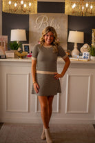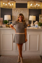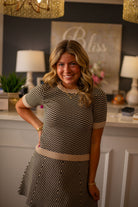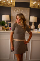 Elevate your wardrobe with the Warren Knit Top and Skirt Set by Lucy Paris. This sophisticated ensemble features a geometric design and a short-sleeve, slightly cropped top accented with tan trim that beautifully complements the matching mini skirt. Perfectly balanced for style and comfort, this set offers a polished look ideal for both casual outings and refined gatherings.
