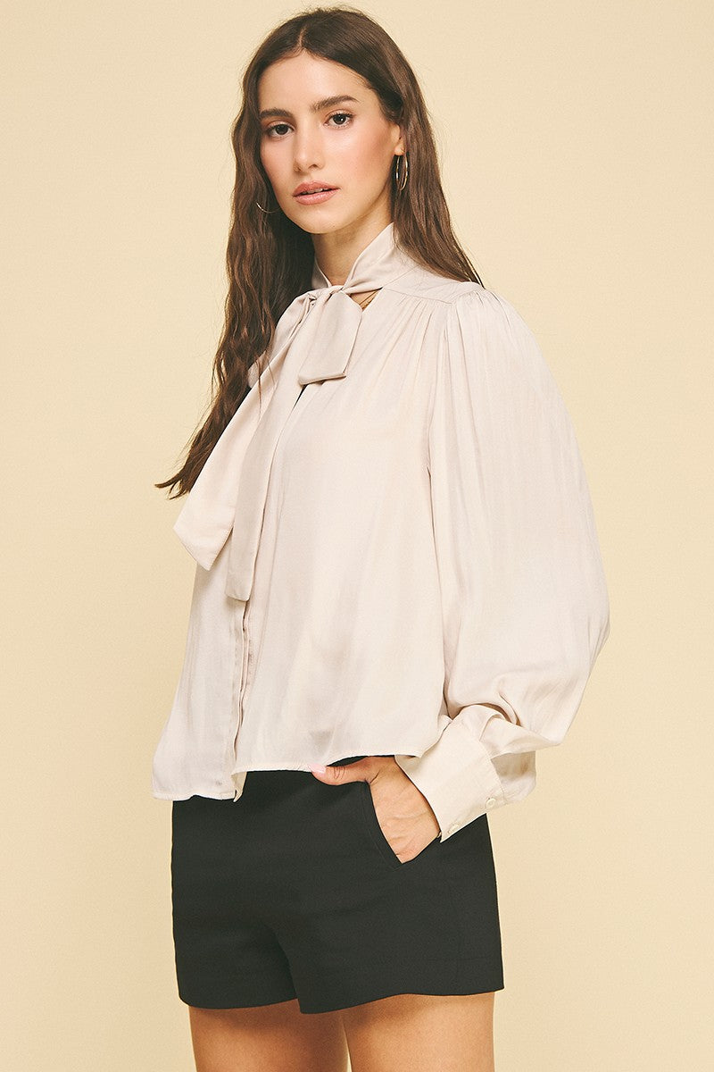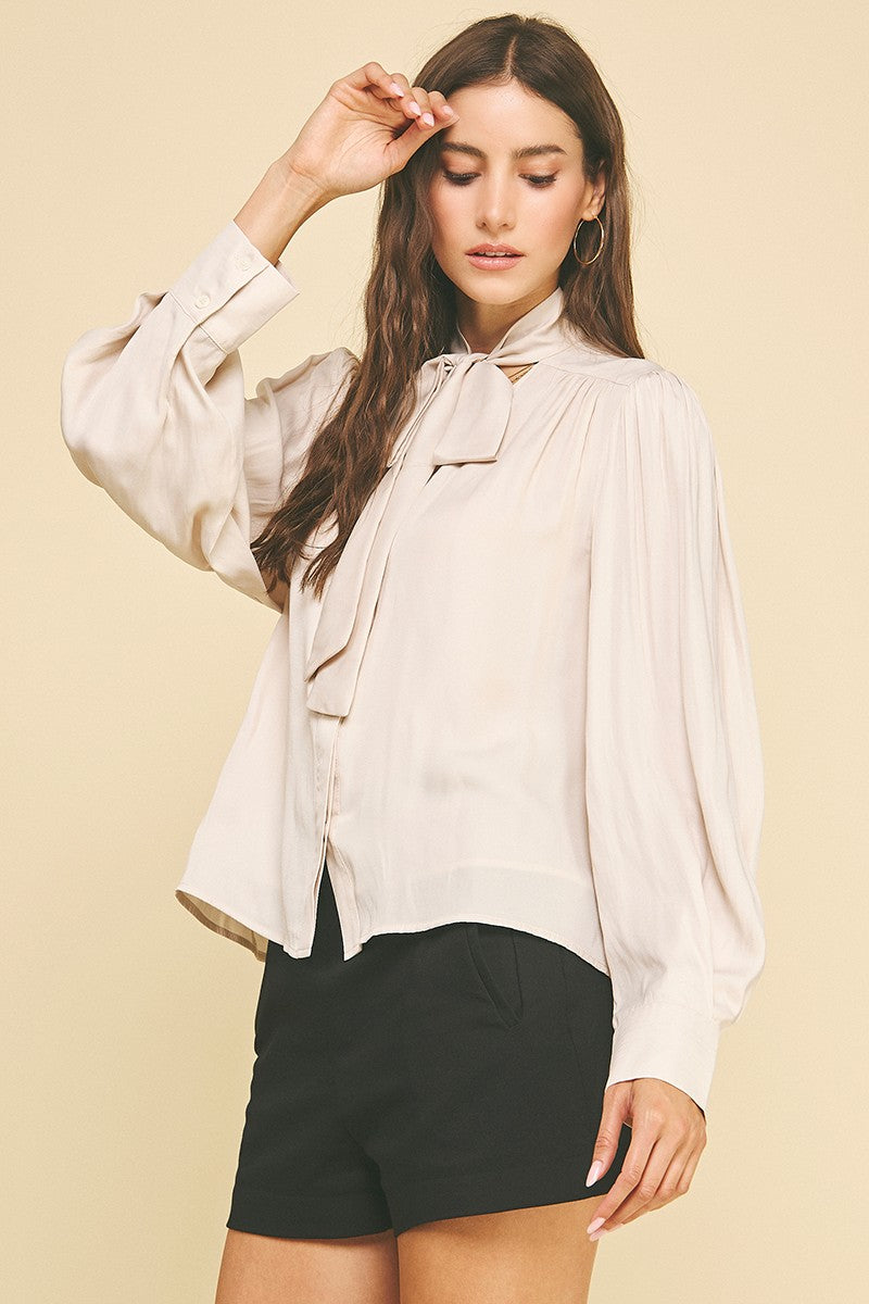 Elevate your everyday look with a timeless piece that effortlessly blends elegance and versatility. Designed with a relaxed silhouette, this top features long, voluminous sleeves and a classic tie-neck detail that adds a sophisticated touch. The soft, lightweight fabric drapes beautifully, making it perfect for both casual and dressy occasions. Tuck it into tailored pants for a polished work outfit or pair it with shorts for a chic off-duty style.