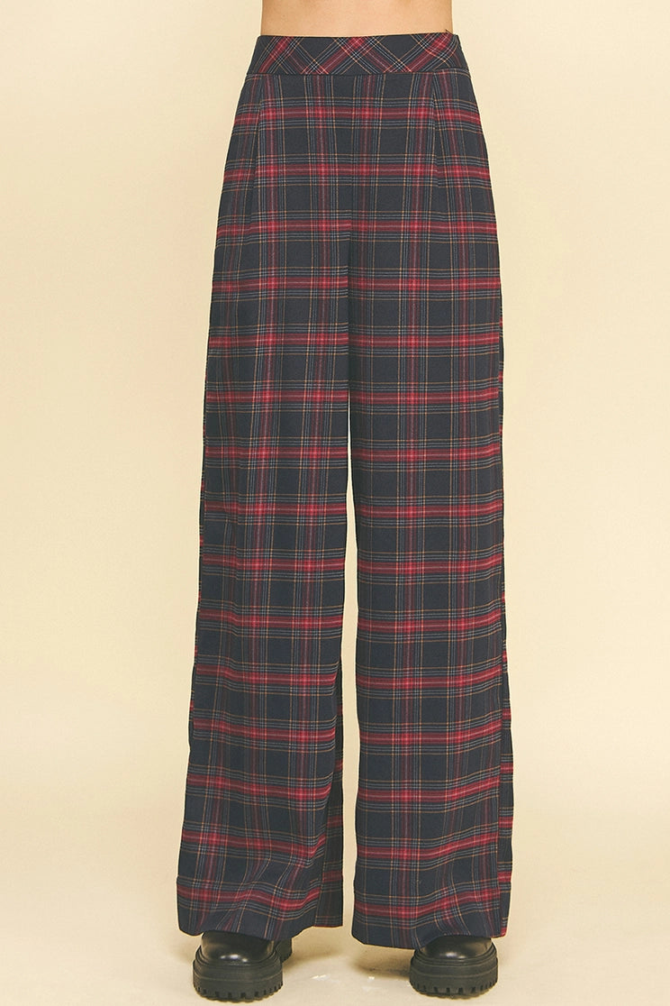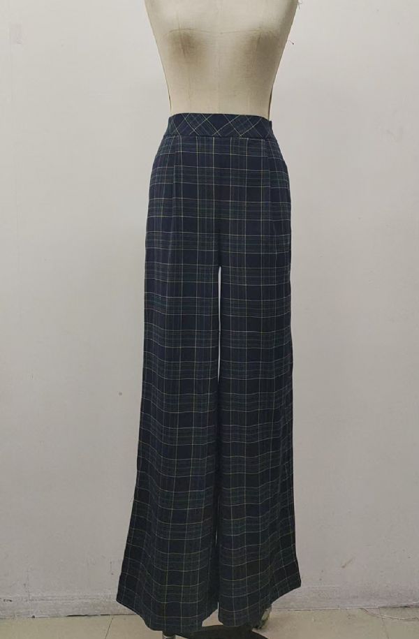 A timeless straight-leg pant designed with a high-waist silhouette that elongates the frame. Featuring a sleek side zipper for a clean finish, it offers both style and practicality with functional side pockets. The plaid pattern adds a touch of classic charm, making it versatile for casual outings or dressed-up looks. Comfortable yet polished, this piece blends everyday wearability with effortless sophistication.