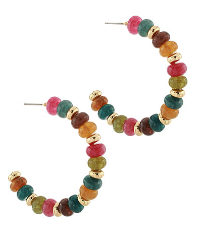 These playful hoop earrings are a burst of color! Featuring a mix of vibrant faceted beads in pink, orange, green, and brown, accented with subtle gold-toned discs, they add a touch of bohemian charm to any look. Lightweight and eye-catching, these earrings are perfect for adding a fun and free-spirited vibe to your outfit.